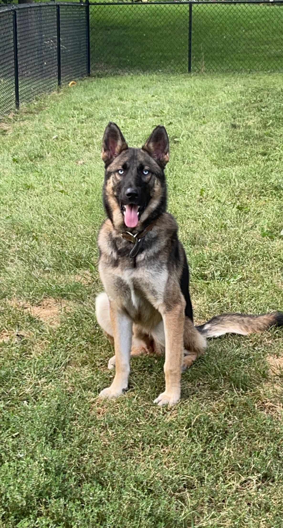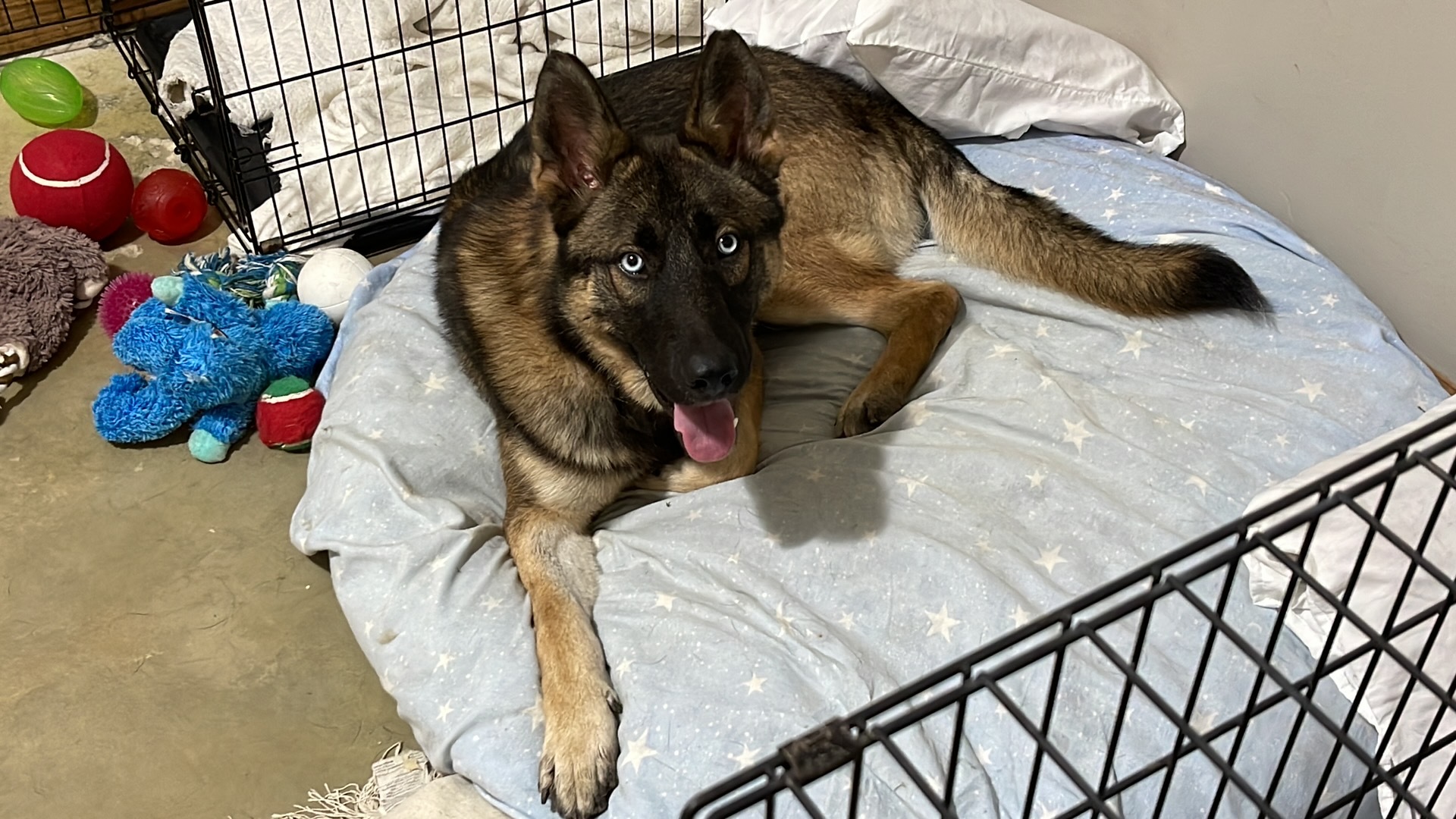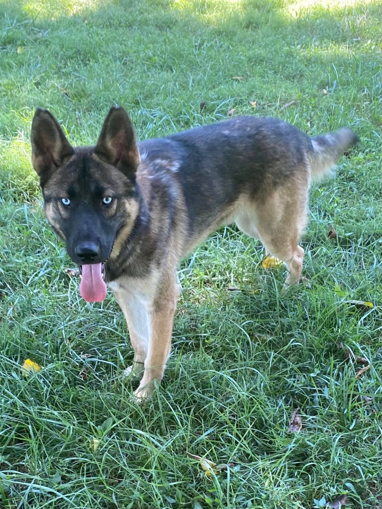 Look at this handsome, blue eyed boy named Frankie Frankie is shy with new people at first but warms up quickly. Once he trusts you he wont want to leave your side. Frankie loves to cuddle and lay on you for pets and attention. He is jumpy/hyper and still has very much puppy in him so will need someone active to help him get all that energy out. He will also need potty trained as he currently is not but will frequently being let out, seems to do well. Frankie is very dog friendly and seems to get along with all dogs. He does have very mild resources guarding with his toys but this can be corrected pretty easily as he usually just shows his teeth when another dog comes close to his toys. He will share his food all day long though! Frankie is cat friendly, all he does is stares at them and if they hiss, he will bark but other then that he keeps to himself. I would recommend Frankie be with middle school aged kids or older since he does jump a lot and will need time to work on that before he is around small kids. Frankie does great on car rides. He is doing great with leash training and is responding well to heel and walk for his commands to stop and go. Frankie is crate trained. He will require to be on a lead or to have a 6 chainlink or privacy fence because when he gets bored he likes to try and hop over my 4 chainlink fence by putting his back feet in the holes to push himself over. Frankie is ready for his forever home and all the love he deserves Are you ready to add this handsome boy to your family?