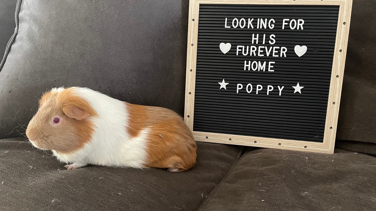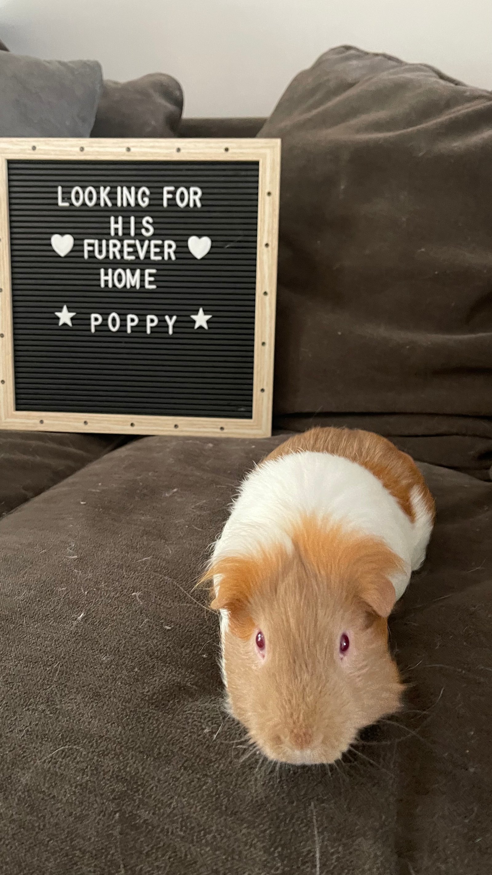 Looking for the most amazing guinea pig for a family with kiddos? Meet Poppy aka Guin Pig! He is an american short haired male guinea pig, 3 years old and a complete ball of love! He will steal your heart with his amazing red eyes and huge personality. He is looking for a loving family where his cage will be centrally located in the house where all the action is (kitchen, living room, etc.). He enjoys interaction and all the attention that he deserves. He does well with dogs as well as the dogs do not chase him and are calm around him as he loves to have some free roaming time. He will come over to you and give kisses as he has such a huge heart. This guy is super special...if you feel that you can provide a loving home for him with lots of attention and love please complete an adoption application at www.furangelsas.org