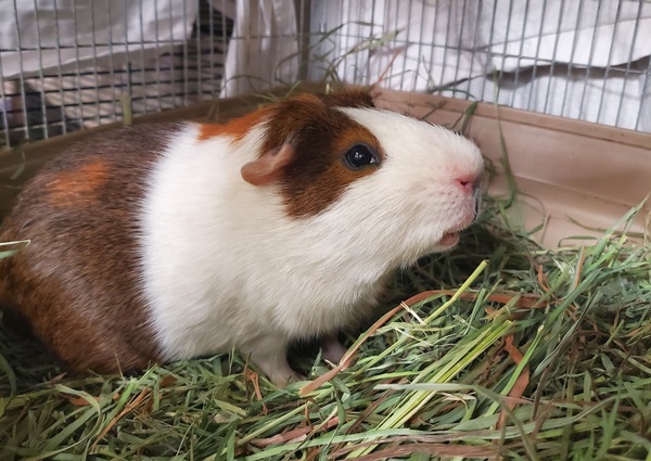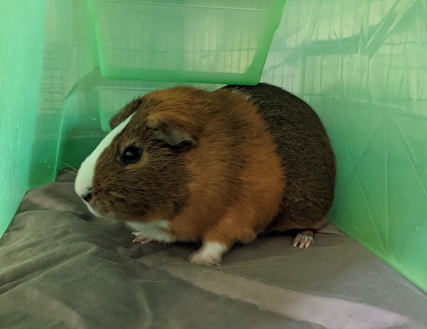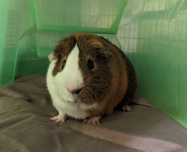 How this pet arrived: Finn was brought in by his previous owner on February 3, 2022. Why this pet is the one for you:Meet Finn! Finn is a bit of a shy guy and is still getting used to human companionship. We know that once he adjusts, he will blossom into a wonderful guinea pig! Guinea pigs, like Finn, need large enclosures with a lot of ground space (8 square feet) to run around and stay healthy. An easy and inexpensive way to give your guinea pig a DIY palace is called a C&C fleece lined cage (google it!). Finn will need unlimited timothy hay to munch on, extra space to run around in, and toys to keep him active and enriched! Healthy greens, veggies, and pellets are also an essential part of his diet, as well as a daily dose of vitamin C! If youd like to learn more about adding Finn to your family, come in and ask about him today!Guinea Pig Care Basics:Click here to learn more about basic guinea pig care! Primary Color: Tri Color Weight: 2.82lbs Age: 4yrs 7mths 3wks