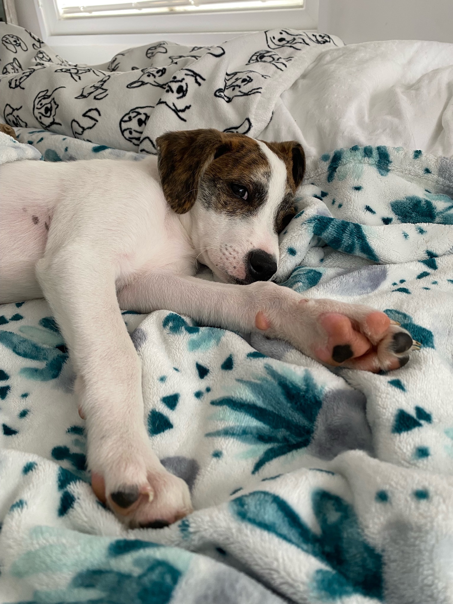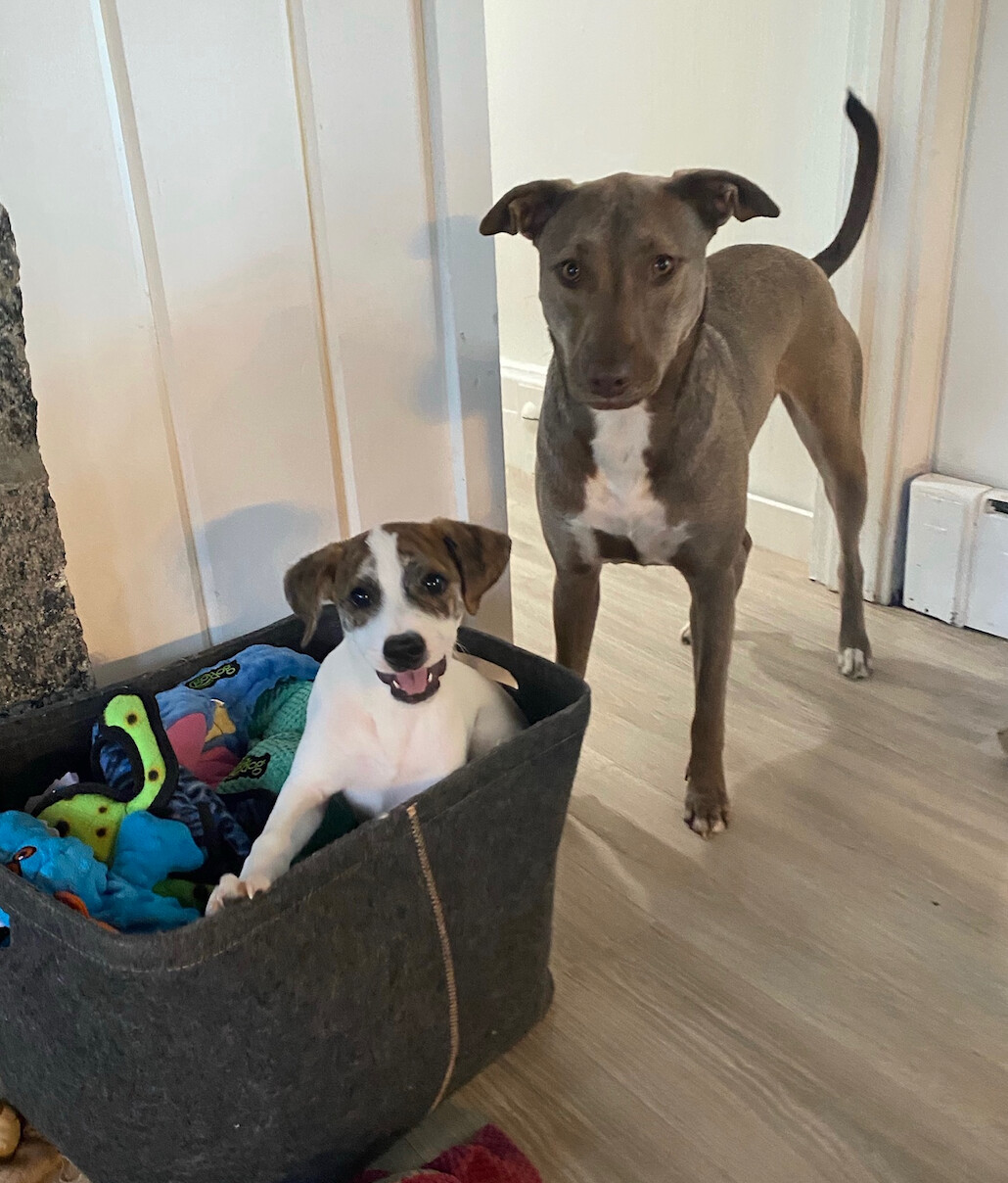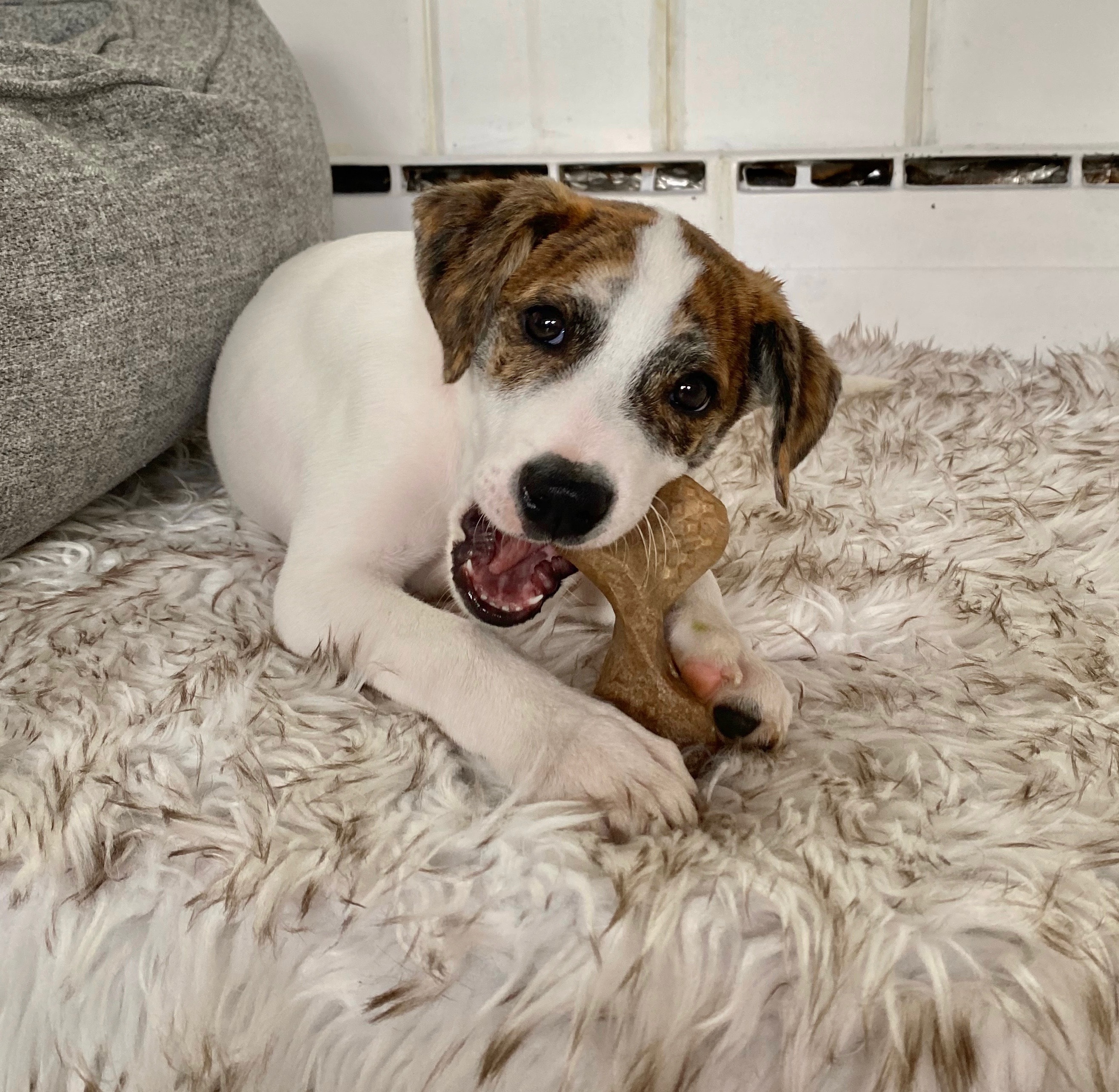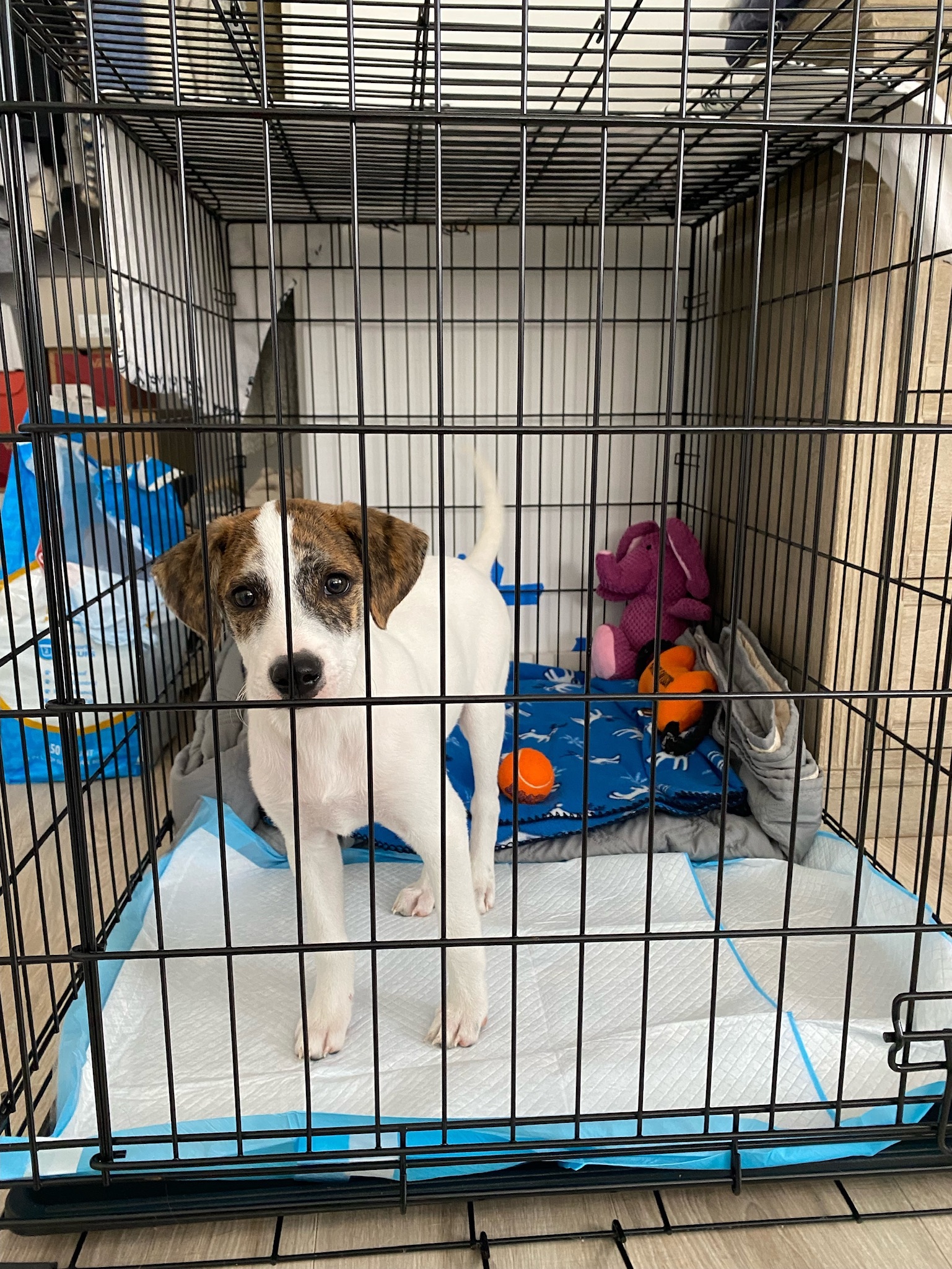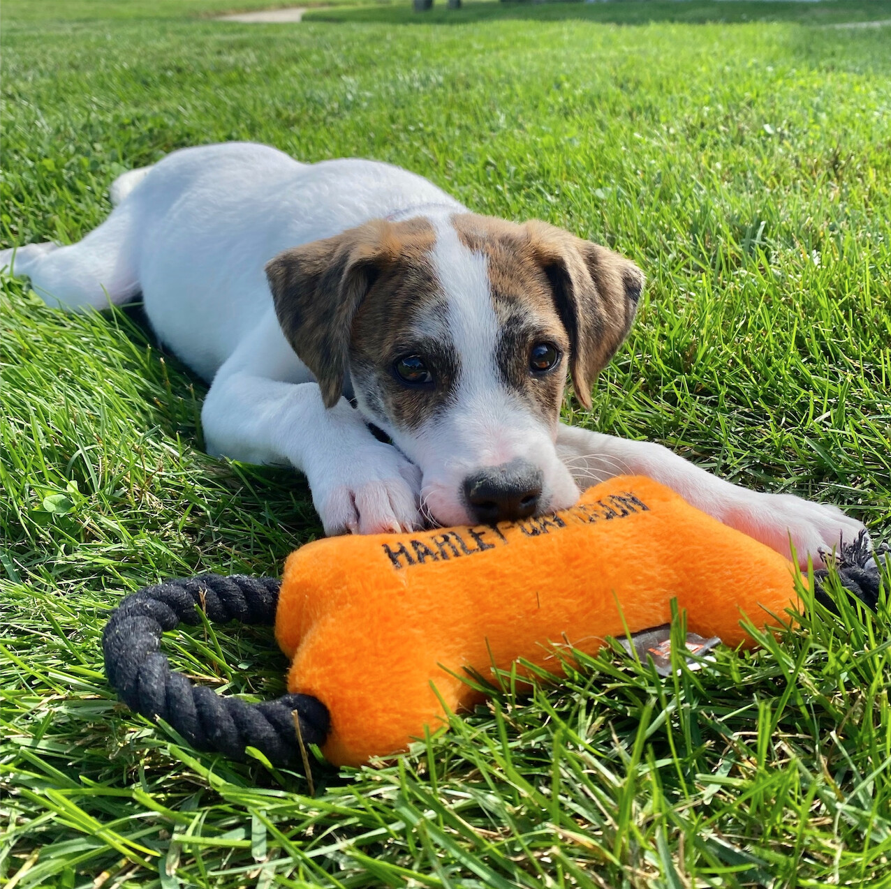 Davey is an adorable 4-month old, 15 lbs Hound/Collie mix. Davey is a very loving and energetic puppy who adores people and other dogs. He loves playing with his fosters dogs but is also fine playing by himself. He really enjoys being outside and running around. He also does very well in the car. He is working on potty training, he’s been going on a wee wee pad but also knows to go outside. Davey is not only super cute but also a smart cookie . He knows sit and give paw. This cutie would do well in any home. Davey is vaccinated and microchipped. The adoption fee is $675. We require a fully fenced yard and not an invisible fence.