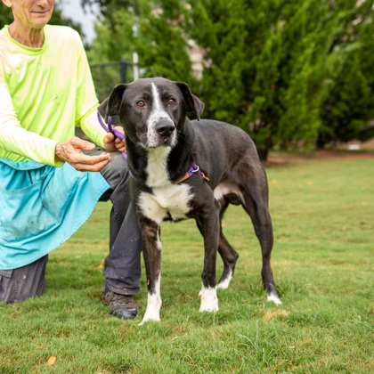 Meet marvelous Maritza! Hes got a stunning black coat, with a white chest, white socks and the most darling white stripe down his face. He did fine in our doggie playgroup so good with other dogs. One of our volunteers shared that, "Maritzo is very sweet, loves to relax in the yard and described him as easy to walk. Hes a social, friendly dog who will make someones life more full."