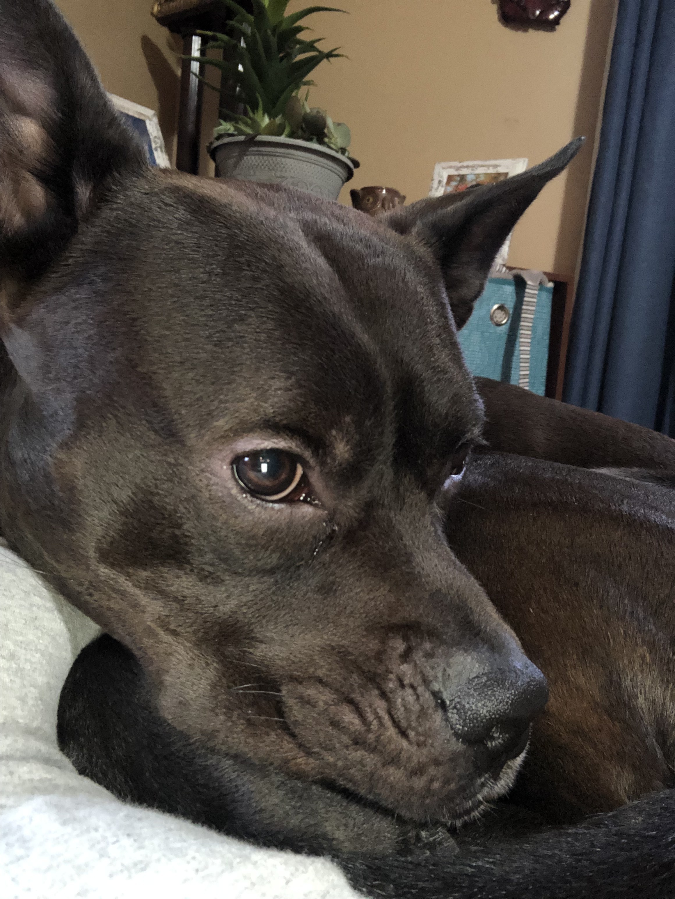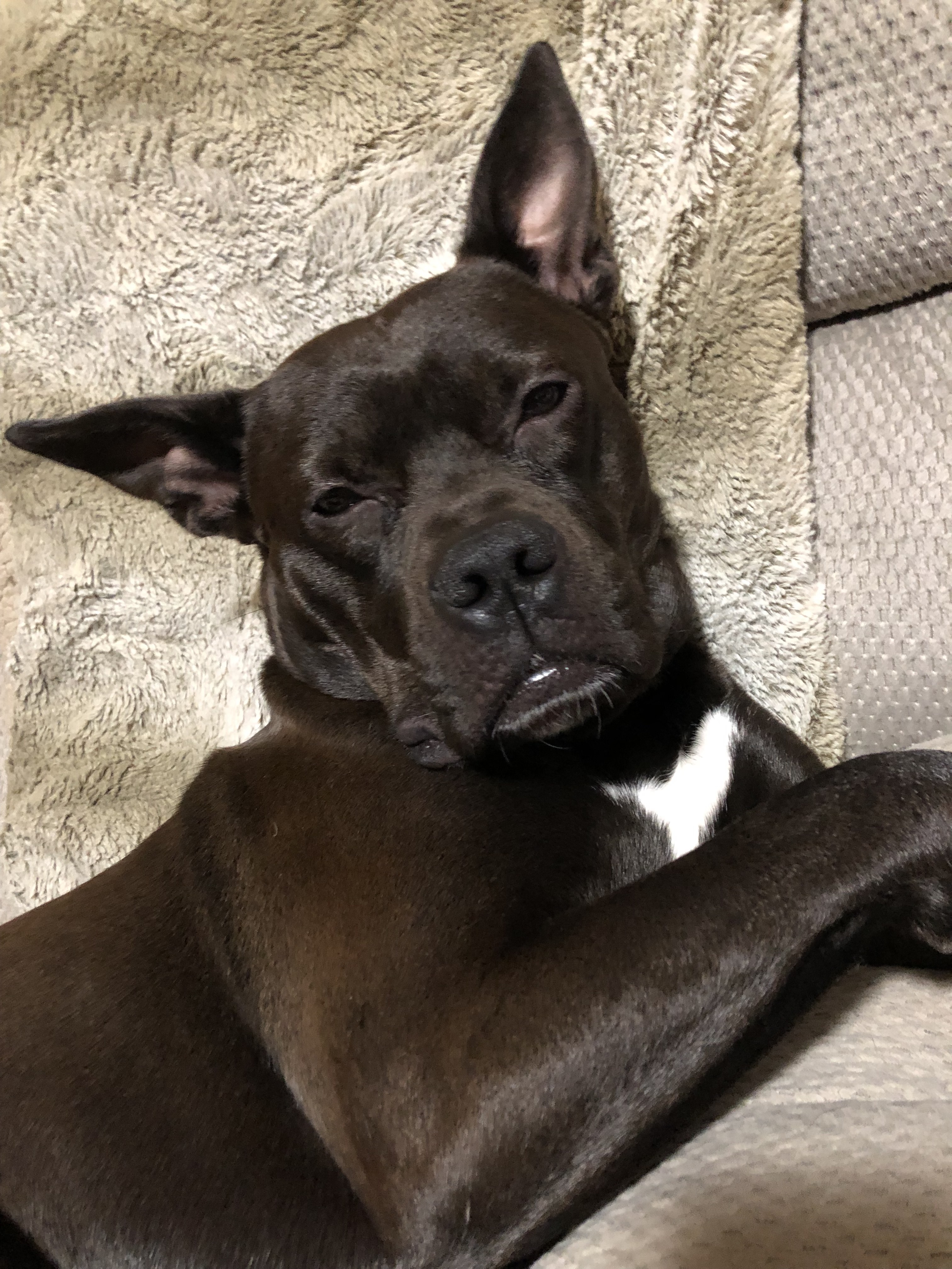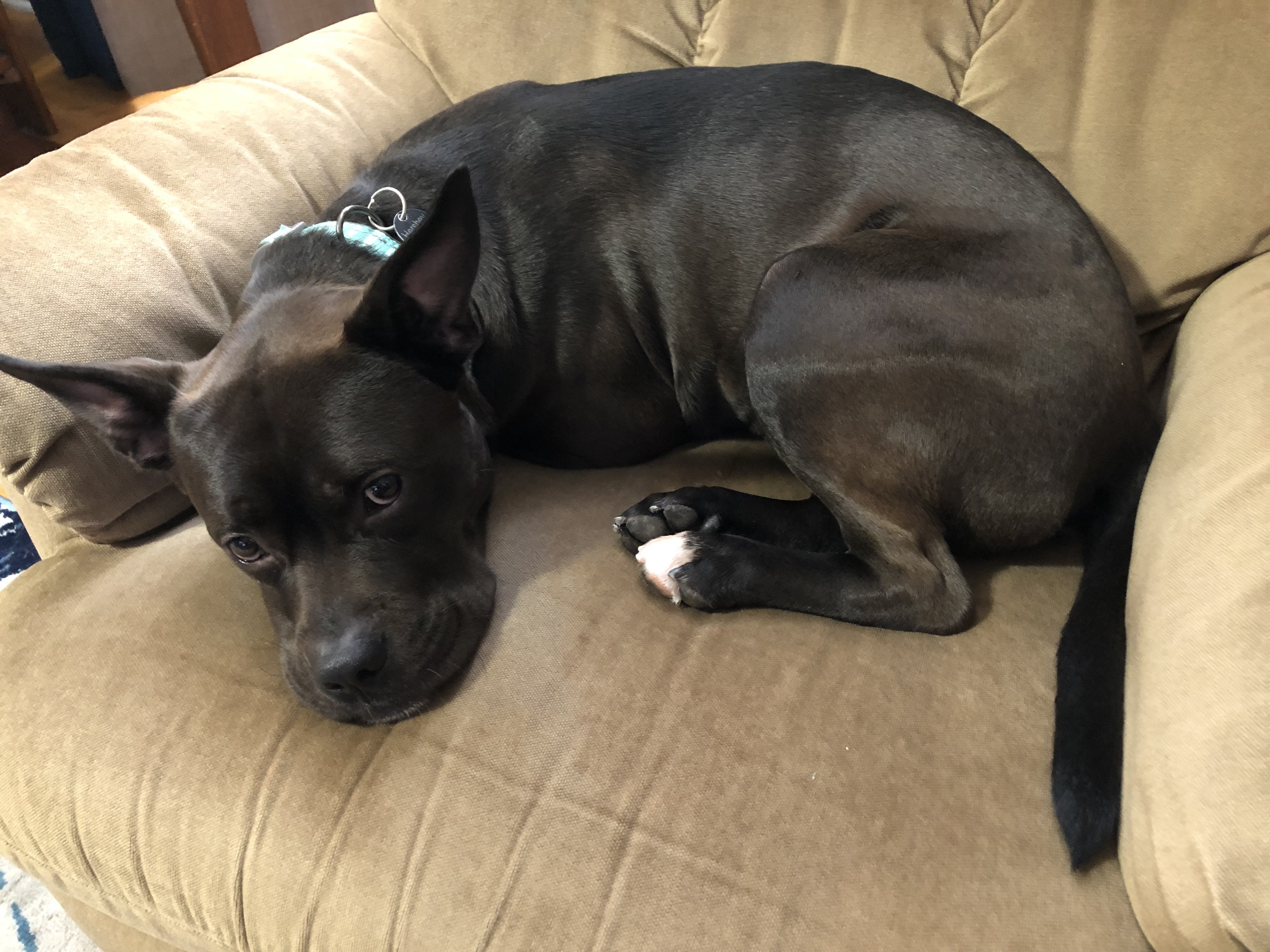 Hershey is kissable, loveable and huggable! He would love a forever family to share his happiness with. Hershey is the perfect weight at about 50 lbs. He still has some puppy energy, but he is very smart and responds to training well! Hershey is a whip at basic commands and is totally house broken. He likes other dogs and also walks great on a leash. Oh and he absolutely loves/lives to play fetch. He will bring you his ball when he wants to play. He will also bring his leash when he wants to walk. He’s becoming such a smart guy! Hershey has not been tested with cats, but does great with his fur (dog) foster sister. He does like the kiddos in his foster home but likes to take things slow and we hope that in his forever home he will have a family willing to take things slow so that he gets comfortable. Hershey only requires that when he’s in his crate (his man cave) that he’s left to enjoy his room. He can get nervous when people are around his man cave. Estimated DOB: 01/05/2020 Does Hershey sound like a great fit for your family? You can apply directly online at our website rescueapittie.org
