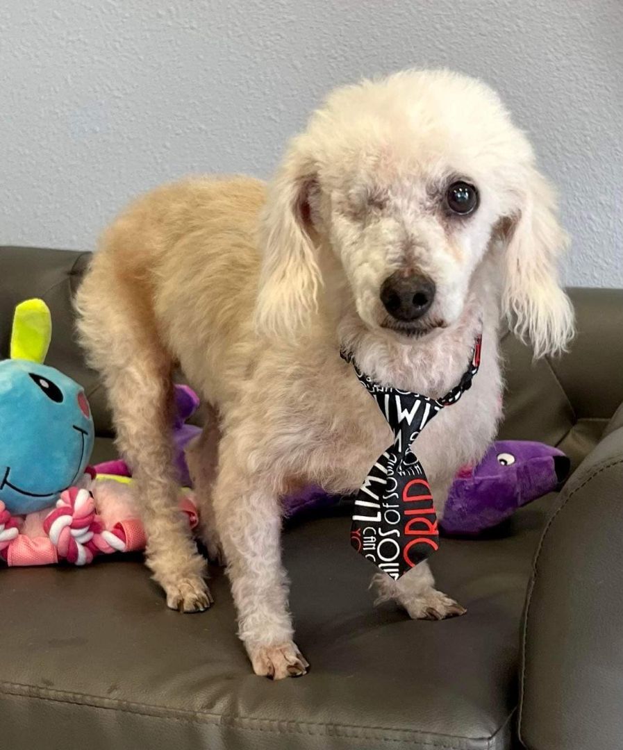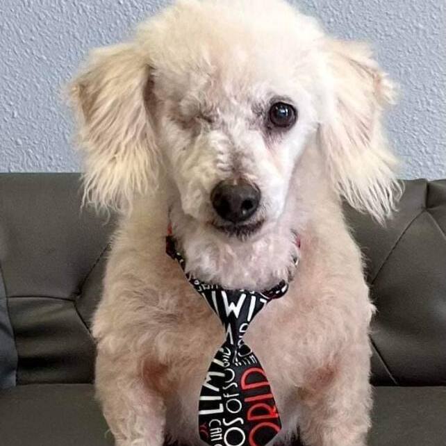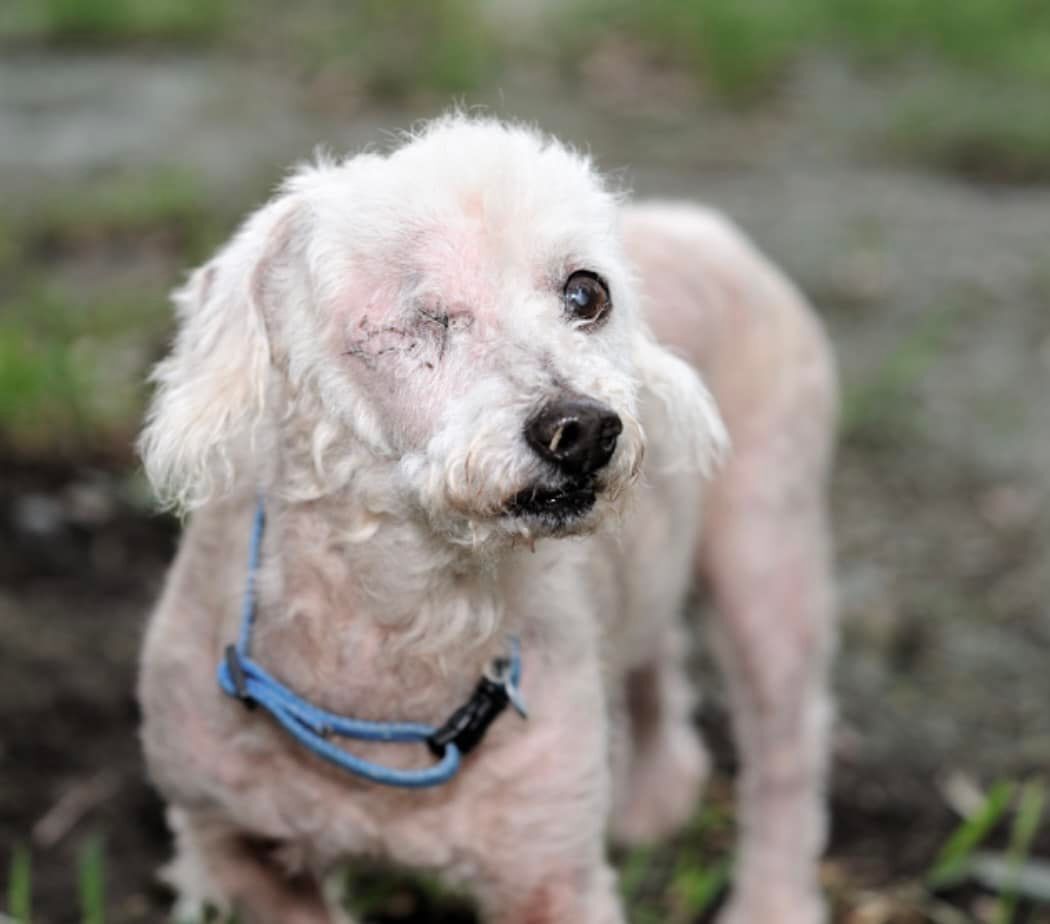 Meet Charlie! He and Freddy were surrendered to our rescue when they lost their senior owner. He is around seven years old and had to have emergency surgery to remove his right eye. He is doing well now and can see just fine out of his other eye. He is like a seeing eye dog to Freddy.