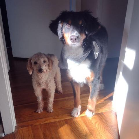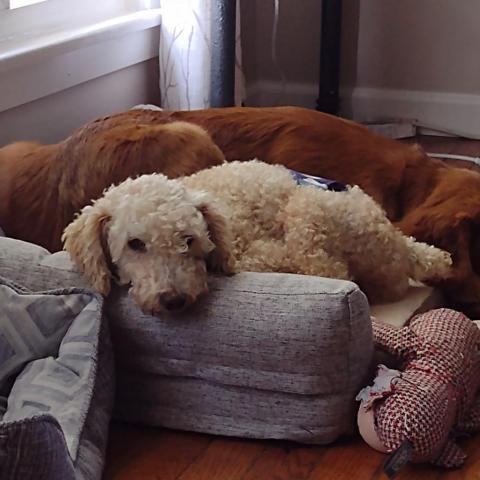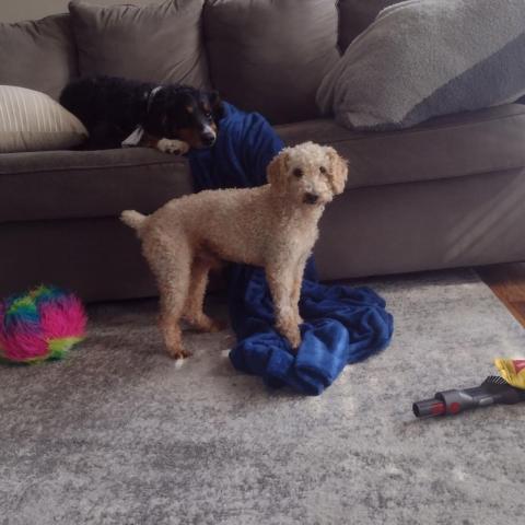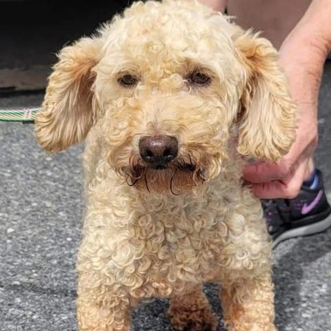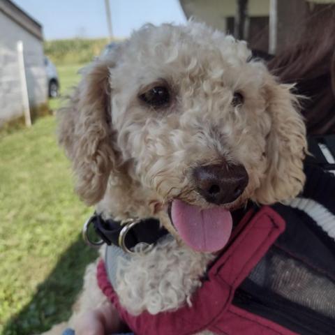 Meet George, or Georgie as hes known by all of his friends. George came to us from a breeding facility, after he was no longer needed. He is as adorable apricot mini poodle who weighs about 13 lbs, the vet believes he is about 7 years old. He originally was very shut down and scared of everything, but he has come out of his shell and is learning to be a house dog in his foster home. He is a true snuggle bug, once he gets to know you. He can be nervous and timid around new places and people but after getting comfortable he has shown to be a great companion! George lives with another pup currently and gets along great with him, and he has done great with all sized dogs! We are recommending George go to a home with another pup so he can continue learning the ropes of being a family pup, and to gain confidence. When walking on a leash he does great in a familiar area. When in a new environment with many distractions he often gets overwhelmed and will not walk on the leash, on the bright side, he does great in a kangaroo pouch and is very content being carried! George has been known to sneak out doors and gates, his forever family will need to be equipped to handle this and work with him on this behavior. Due to Georges size and nervousness around new people, we would prefer any children to be dog savvy and over the age of 12. George is housebroken, however. he does have a habit of marking and wears a belly band in his foster home, his new family will need to continue working on this behavior and regression is common when changing environments. George is up to date on vaccinations; neutered and had teeth removed while in our care. If you think George is a good fit for you please fill out an application!