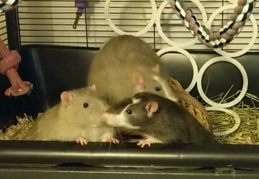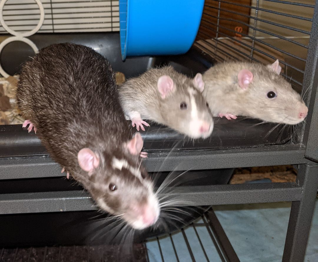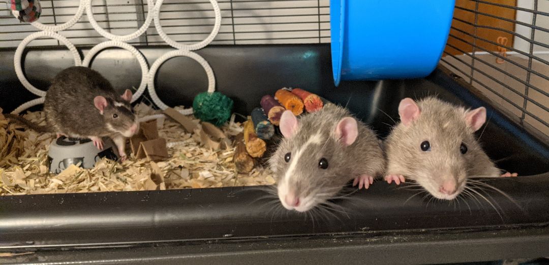 Look no further if youre looking for a trio of fun spunky boys! Introducing Bruce (solid gray), Andre (gray with white stripe on his face), and Dwayne (black with a white stripe). These three male rats are approximately 1.5 years old. They come in sizes small, medium, and large! They are very active but still appreciate a good nap! Bruce and Andre are okay with being picked up and enjoy pets and scratches. Dwayne is a little slower to warm up to you than his brothers, but he will take treats from your hand and likes to come out for playtime with his brothers. With a little patience, these three boys will warm up to you and start to show their goofy personalities. They enjoy playing chase, climbing, and foraging toys. Their adoption fee is $30. Adopters must be at least 18 years old.