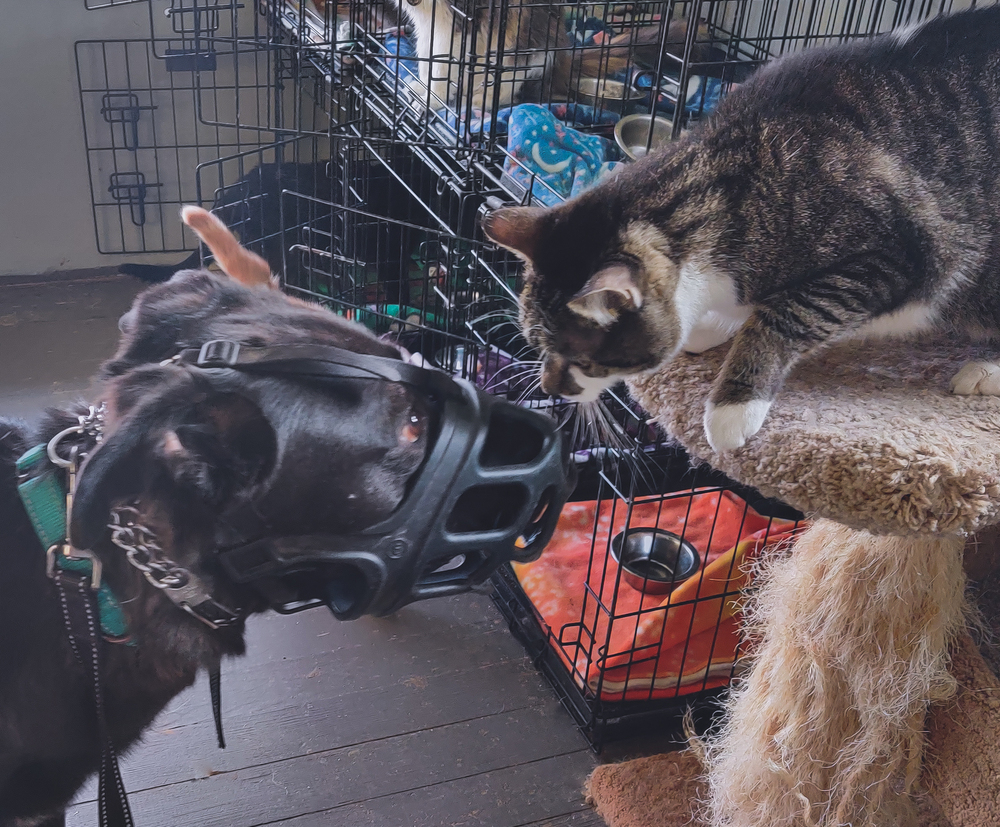 Kay/O is a handsome large dog that appears to be a shepherd lab mix of some sort. He arrived to the Mission from Carbon County Animal Services in Utah when he was past his euthanasia date for lack of space. He is approximately 75lbs and has an estimated birthdate of 01/02/2021. At the three month mark in rescue, Kay/O has settled in very nicely. He has learned sit, how to wait at a doorway, loves to go for car rides, aced a trip to Home Depot, and has become a great snuggle buddy and showering assistant, carefully licking the water drops off of his persons legs. He also loves to be groomed and took the entire process in stride like an old pro, even leaning into the force dryer to get a better feel of the warm stream of air. He takes fluoxetine 40mg to help decrease his containment anxiety issues and his crate destruction has stopped although he still displays some signs of generalized anxiety like over arousal and vocalizations when contained or overstimulated. This medication is very beneficial to anxious dogs and is very affordable, so we anticipate it may be the best option for him for the coming months. Kay/O has been spending the last few weeks getting tuned into cohabitating with other animals and hes doing great. He would do ok in a home with dogs and or cats as long as they were used to large dogs that have rough and rowdy personalities. Kay/Os best feature is that he loves playing ball, and hes so eager to fetch that its by and large the simplest path to teach him. Kay/O also has a nice willing personality naturally which will help him learn new skills and trust more environments and people without shutting down. Kay/O comes neutered, vaccinated, microchipped, and dewormed. His adoption fee is $200 and includes his leash, martingale collar, herm sprenger prong collar, muzzle, ID tag, food sample and paperwork. To be considered to adopt, please begin by visiting www.murcismission.org and sending in an application. Thank you for checking out our boy!