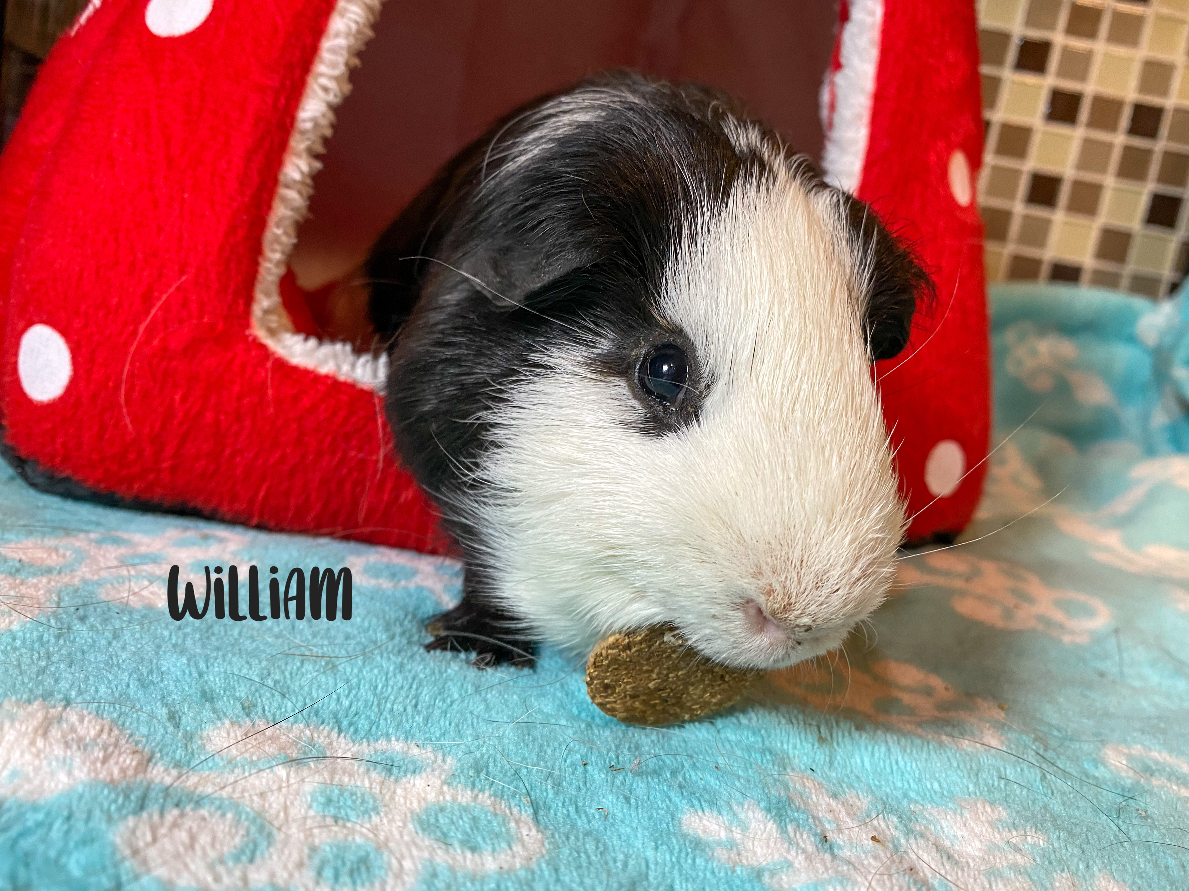 William has been recently neutered and vet checked here at the Pipsqueakery in Bloomington Indiana! As with most guinea pigs, he will need time and attention to come out of his shell. We require that you adopt guinea pigs in pairs if you dont have a guinea pig already and that you be able to travel to us to adopt. Adoption fees are $40 for one guinea pig and $60 for a pair. You can apply here to adopt: https://www.thepipsqueakery.org/adoption We have a lot of guinea pigs available for adoption, so if you dont see one that you think is for you, I bet we have plenty more where that came from!