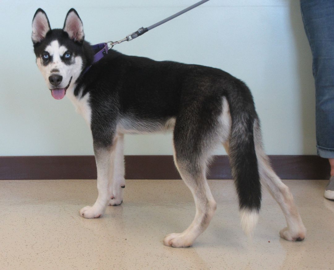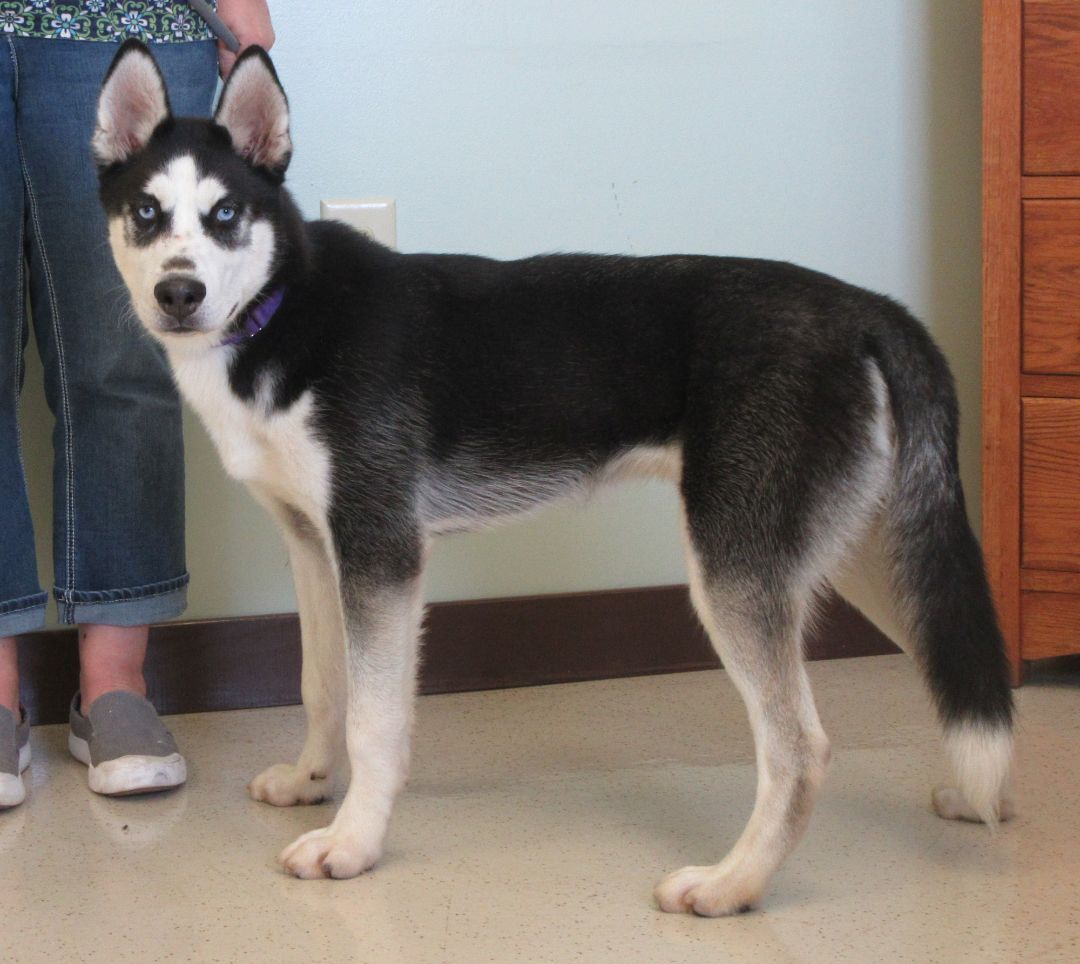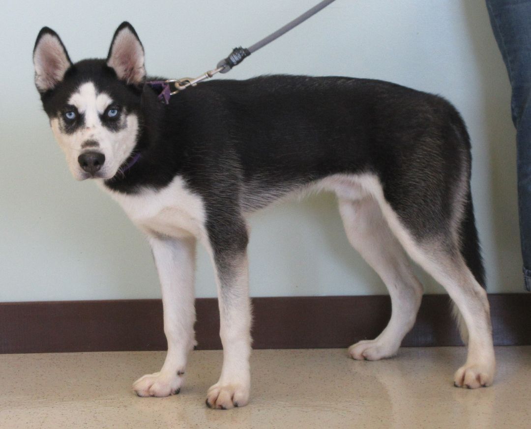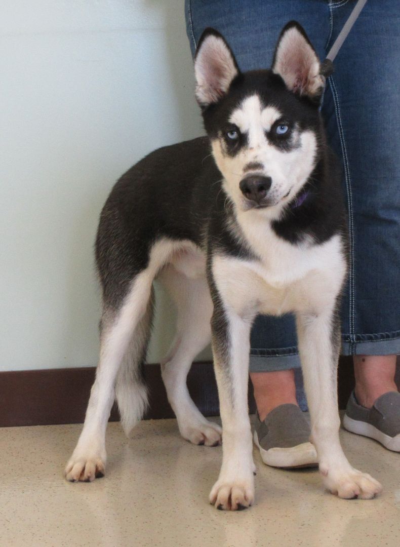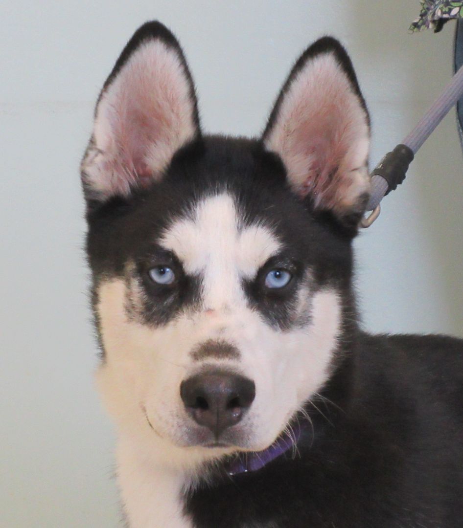 Kota is a 7 month old Siberian Husky. This sweet boy was surrendered to the shelter after his family was no longer able to care for him. He has black and white coat and look at those striking blue eyes! In his previous home, he lived outdoors. We are teaching him that indoor life is much more comfortable. He can be a smidge shy initially but it doesnt take long for him to warm up to you. Kota has lived with kids ages 10-15 years old. He is very playful and excitable. Kota will need a home that has the time and energy to continue his training. We think Kota will benefit from another dog in the house to teach him the ropes of his new life. He likes to have lots of friends. Kota is quickly learning to walk nicely on leash. He may not always walk in a straight line, but hes learning. A bit of food motivation always helps. Dont pass this sweetheart up, hes sure to win your heart.