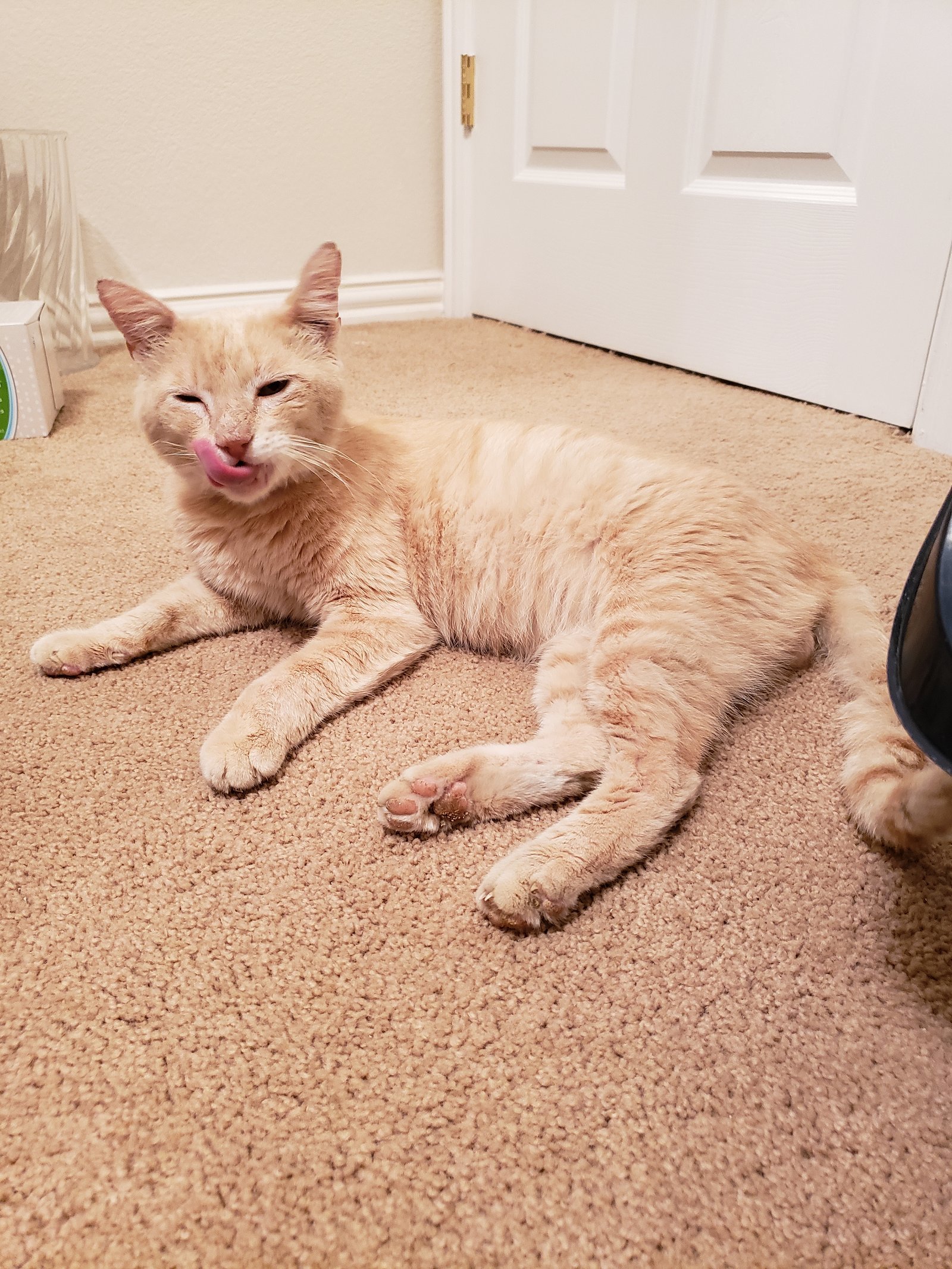 Nabi, which means butterfly in Korean, is an adorable DSH buff tabby male born approximately 7/7/2020. "Life on the streets was not kind to me. This nice lady at Vaughns Donuts in Garland would feed me every morning. Then, one day she noticed I was injured and called NBCR to help me. Not only did they help me with my injury, but they decided I was nice enough to not return to the streets. My front leg is healing after being on medication and I am now able to bear weight on it. Unfortunately, then my back leg paw started bleeding. The doctor told me I had "pillow foot." It is a condition that evolved from my living conditions and nutritional needs. All my paws seemed to be in bad shape, but now I am on medication for it. This treatment may last for several months to get it all cleared up. After spending most of my time under the bed at my fosters home, I now feel good enough to be around all the other fosters and love the pets and attention I am getting. I am a bit nervous around other cats, but slowly learning to just ignore them and we all get along. I follow my foster mom all over the house now, but havent quite mastered being a lap kitty. Although I am not used to it YET, I know with time and patience, I will learn how (along with a lot of other fun things indoor kitties know how to do!) I want to play sometimes, and maybe after I feel a lot better, I will be even more playful. Right now, I mostly enjoy being around people, just relaxing. If you are able to just enjoy my company and help me heal, then I just may be your cat and you my person!" Nabi is microchipped and currently in a foster home. His adoption fee is $105.