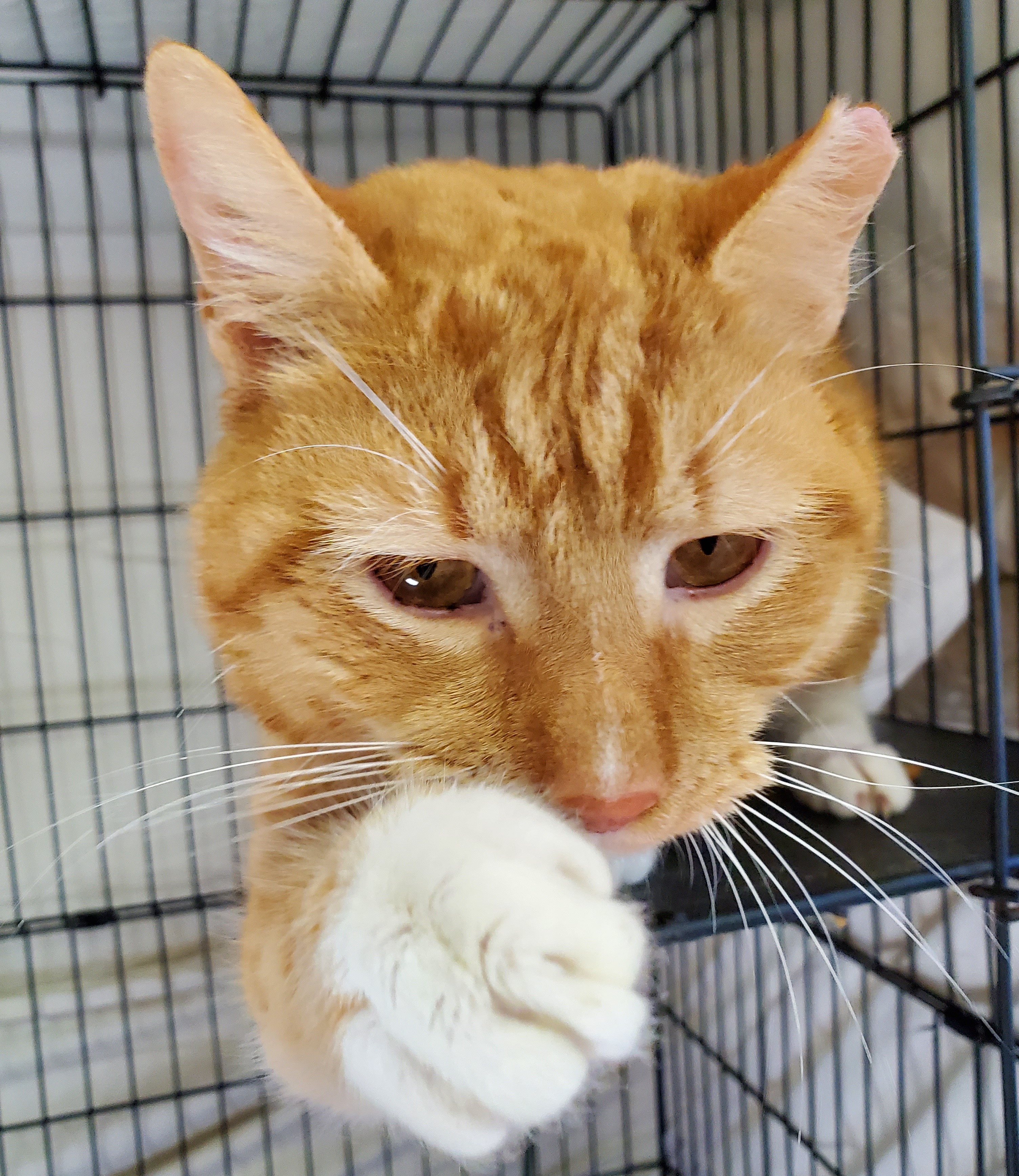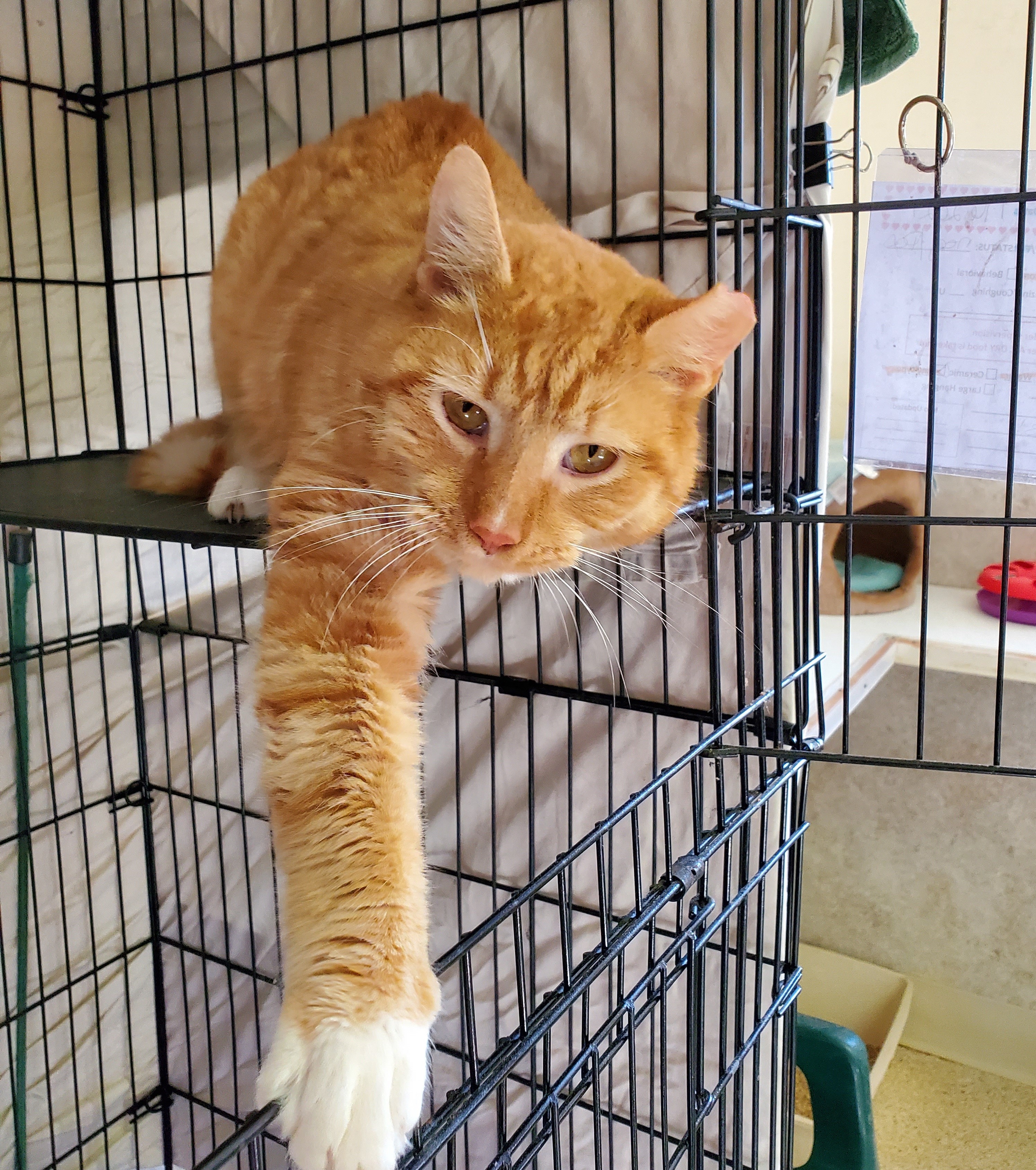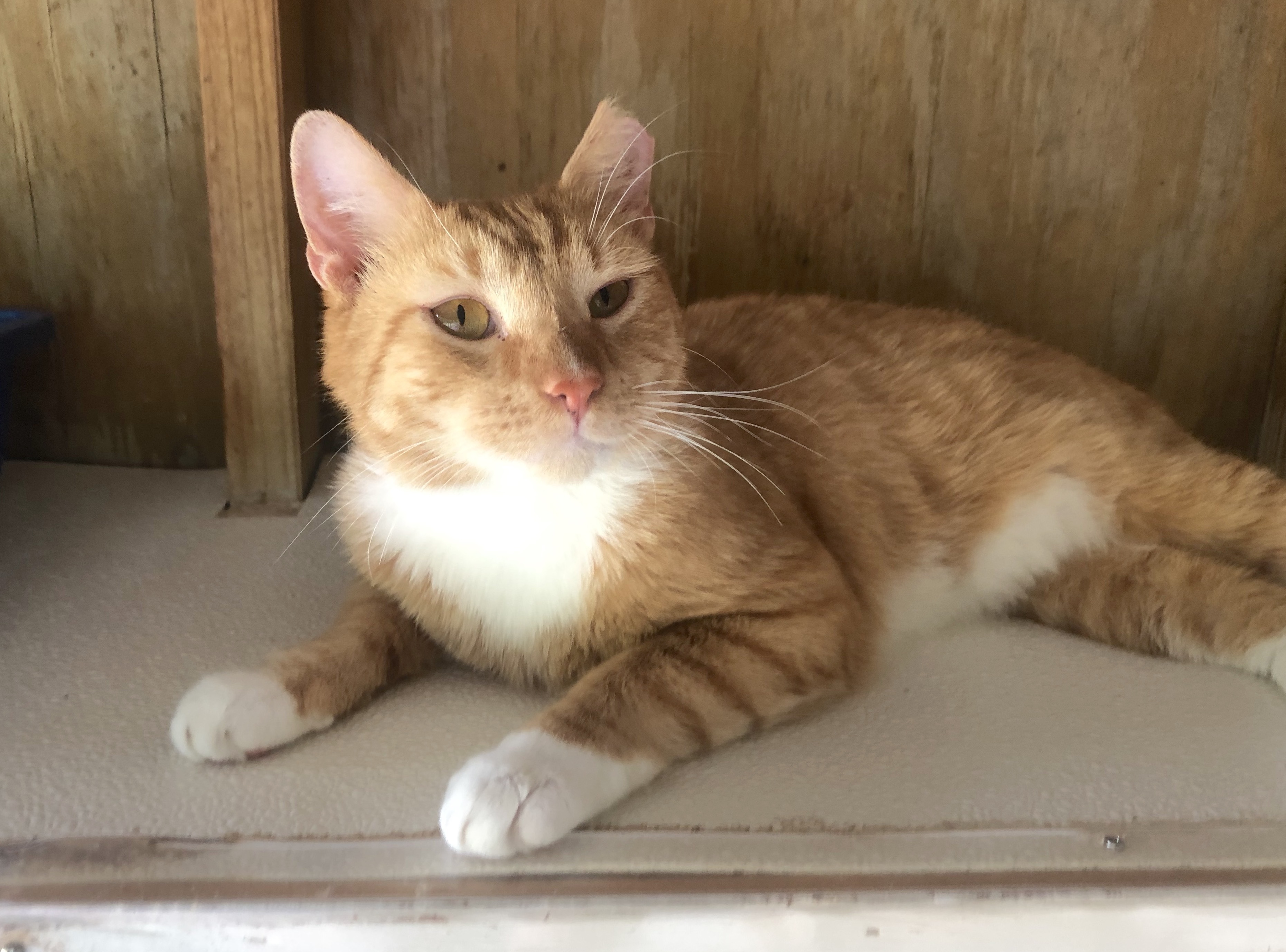My name is Mr. Cat, but I’d rather be Mr. [your last name]! THE BASICS: DSH; orange tabby with white ADULT MALE; Est DOB: December 11, 2018 ARRIVAL: January 16, 2021 HISTORY: Mr. Cat was a neighborhood stray who was trapped so a leg injury could be treated. MEDICAL NOTE: Mr. Cat tested positive for FIV. Mr. Cat came to us after a resident of the neighborhood he frequented trapped him so his leg could be treated for an injury. After taking him in, the vets realized he was FIV+ and thus could not be released back into the wild. Since he was friendly and well-liked by the neighborhood, the resident attempted to take him in herself, but her other cats did not like him. He found his way here, and we are so happy to have him. Mr. Cat only needed a couple of days to get used to his new home before he was sidling up to staff members for pets. He is incredibly affectionate, and as you can see from his photos it can be hard to get a good picture of him since he wants pets so much! He also gets along well with the other cats in the room and enjoys playing with fellow R3 resident Bronx. We quickly fell in love with him and have enjoyed watching his personality continue to blossom. If this bubbly boy sounds like he’d make a good addition to your family, come meet him for yourself and seal the deal!