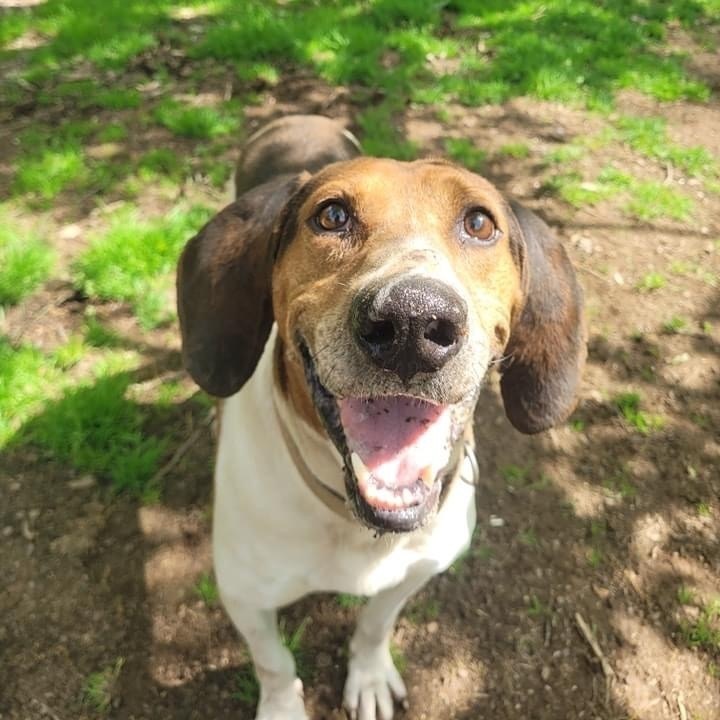 This sweet boy is Tracker. He likes to take long walks, and he is looking for a family of his own. Tracker is about 7-8 years old, neutered, up to date on vetting, house broken and crate trained. He is a Treeing Walker Coonhound mix and like all hounds, he likes to use his nose, and he likes to bark about it! He would not be ideal for apartment living. But he is ideal for an active human or family with a yard who is looking for a best friend. He is tons of fun to take on walks. Tracker gets along well with other animals, canines and felines alike, although he does prefer to keep to himself. Tracker has had a rough go of things. He arrived very thin and with a terrible backstory which includes being beaten with a metal pole. He has gained weight, and weve promised him he will know nothing but love from here on out. His adoption has been sponsored! Applications for adoption are available on the Empire Animal Rescue Society (EARS) website at www.empirerescue.org