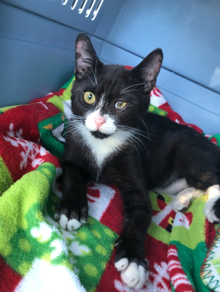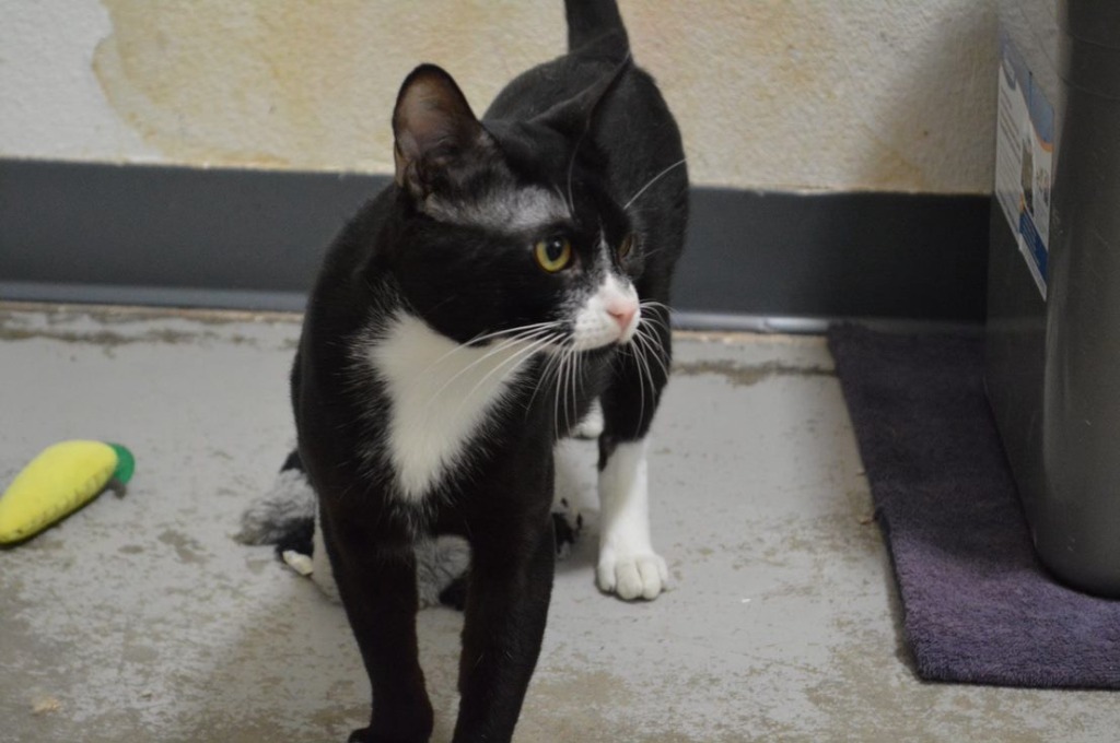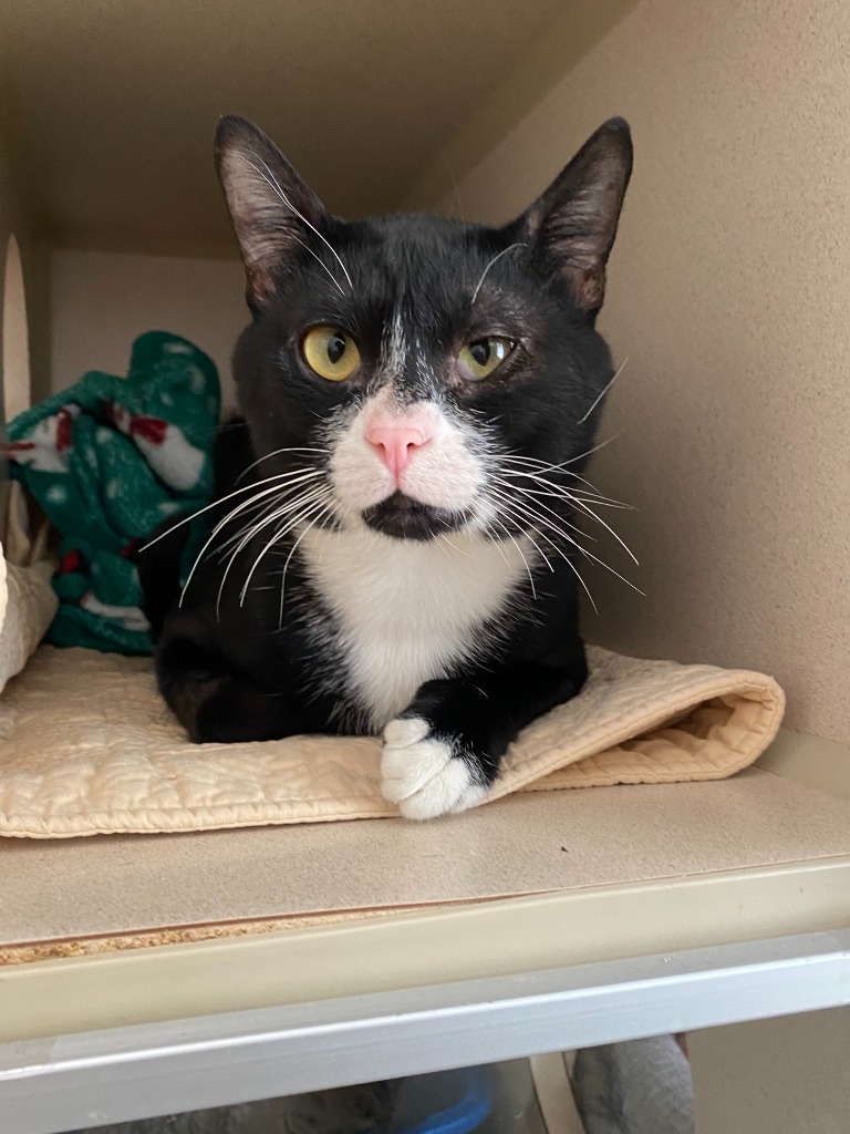 Meet Hugh, our 1 year old tuxedo sweetheart! He had some issues with his third eyelid being present earlier this year, but with surgery and great treatment, he has recovered quickly! All the staff at the vet will crowd around and love on him as he lays back to bask in the attention. His eye will always be a little raised, but that doesnt stop him from being the best boy ever. Hugh loves to play, eat treats, and will rub his head all over you to get your attention. Hugh is a loverboy, and youll absolutely fall in love with this charming guy the moment you meet him! If youre interested in Hugh, please give us a call at 661-251-5590 or email us at st.bonnies@gmail.com. You can also fill out an application online at: https://langefoundation.org/cat-adoption-application/