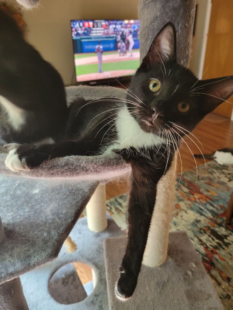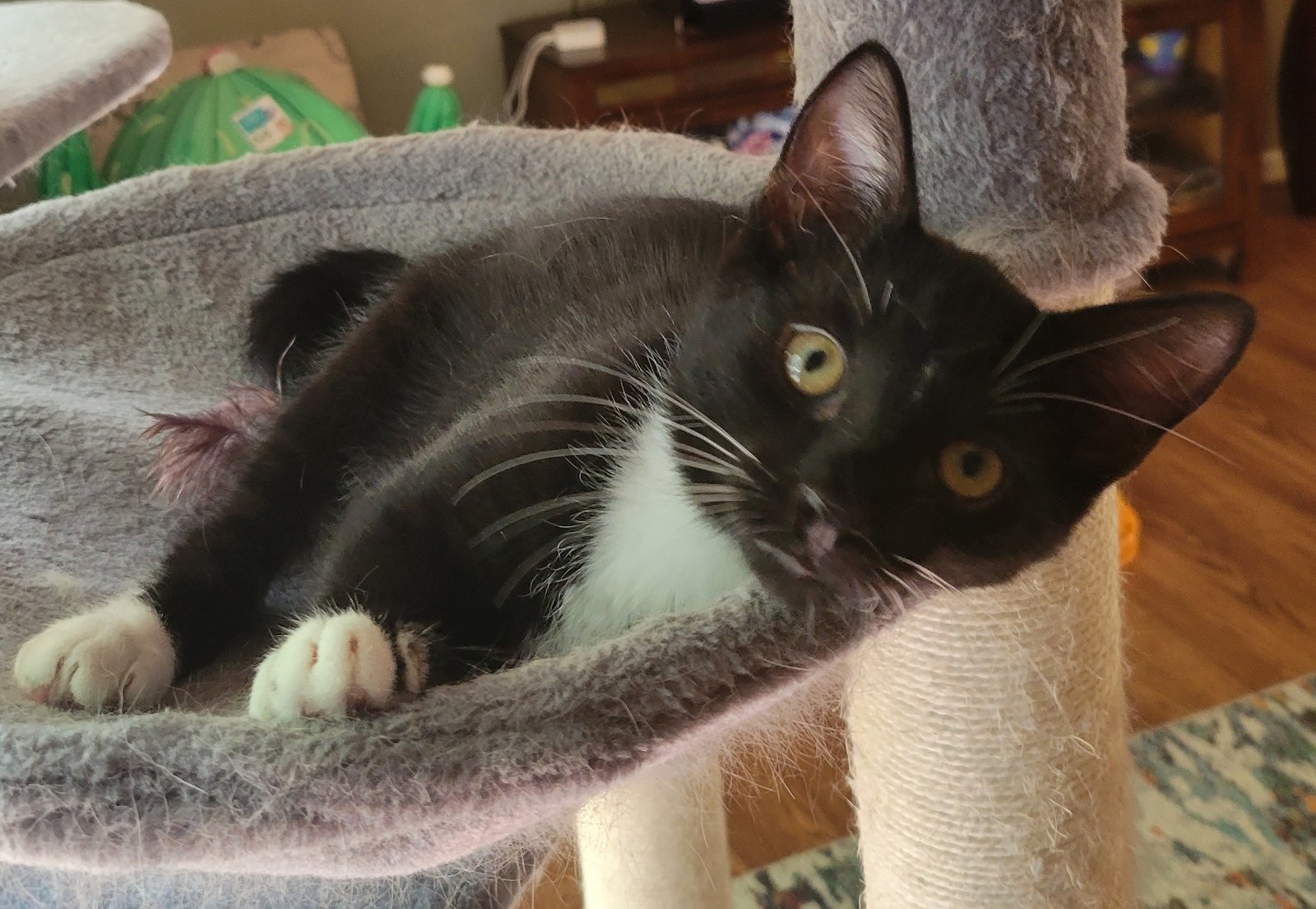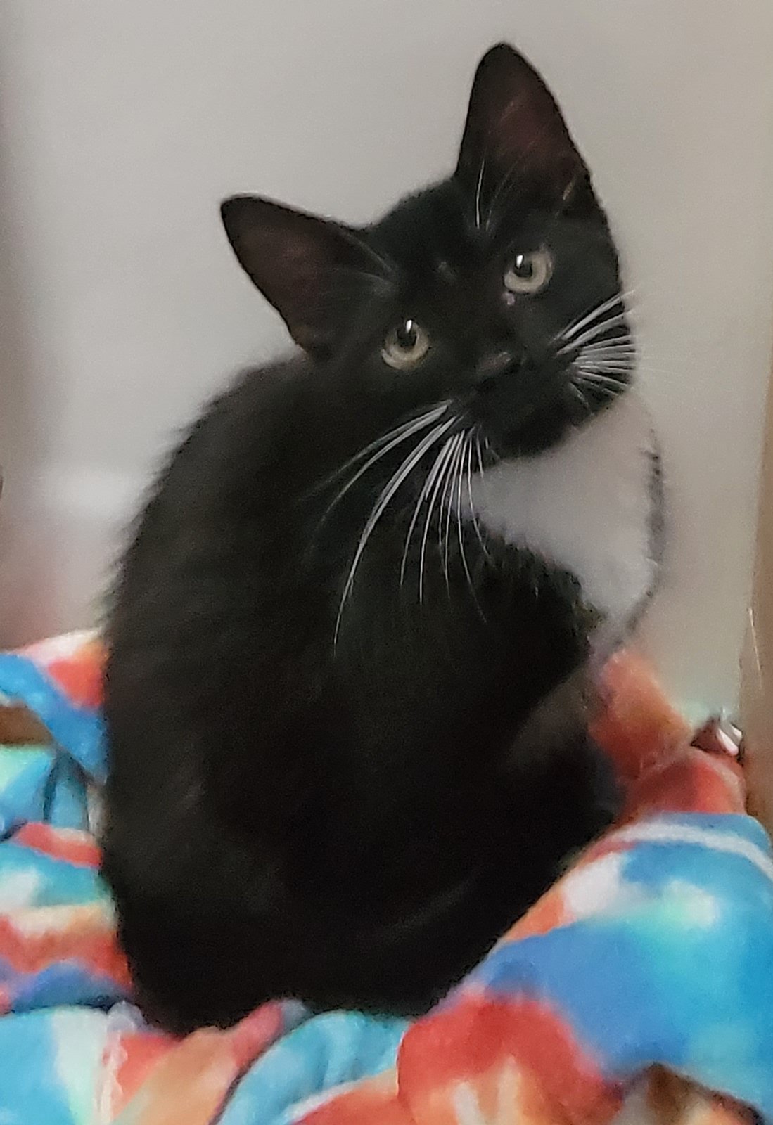 Please meet SpongeBob (FCID# 06/20/2022 - 43, Tuxedo, all black face)! SpongeBob is a curious, friendly, and affectionate kitten (smart, too!). He loves to play with all toys and hasnt met one he doesnt like. He was raised in a foster home with 3 other cats (all different ages) and a small dog. SpongeBob and his foster sister Lex (FCID# 06/20/2022 - 66) are hoping that you will ask to meet them although they do not need to be adopted together. Here is the link to our no-obligation adoption application: https://forgottencats.org/adoption-application/ . Thank you! (Foster: Kara T.)