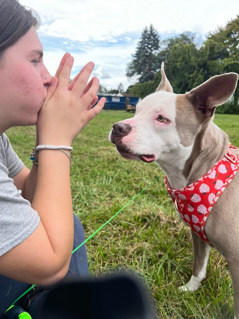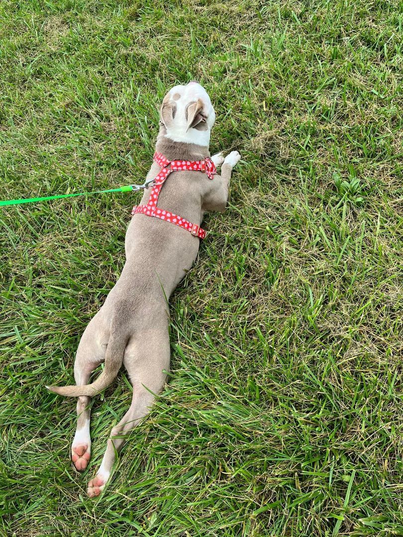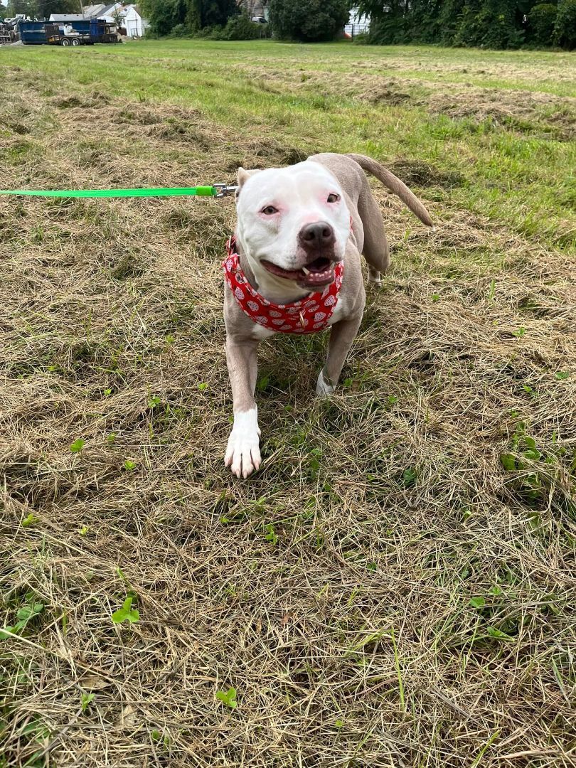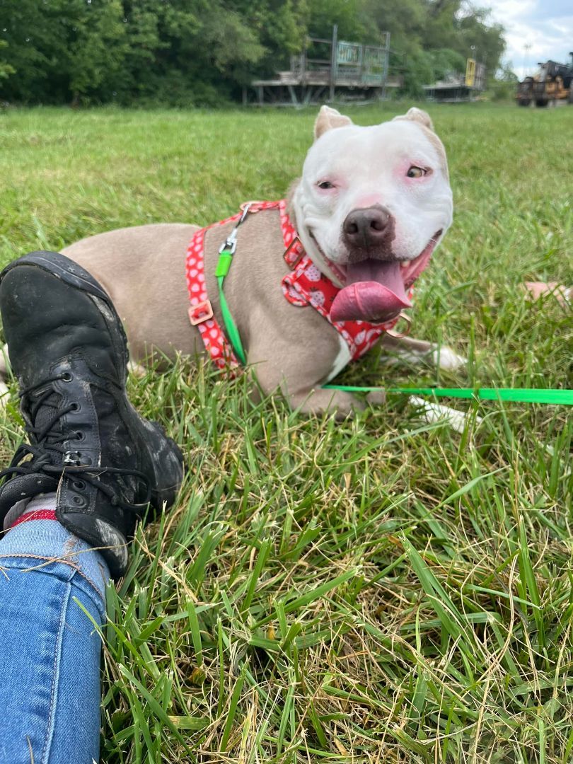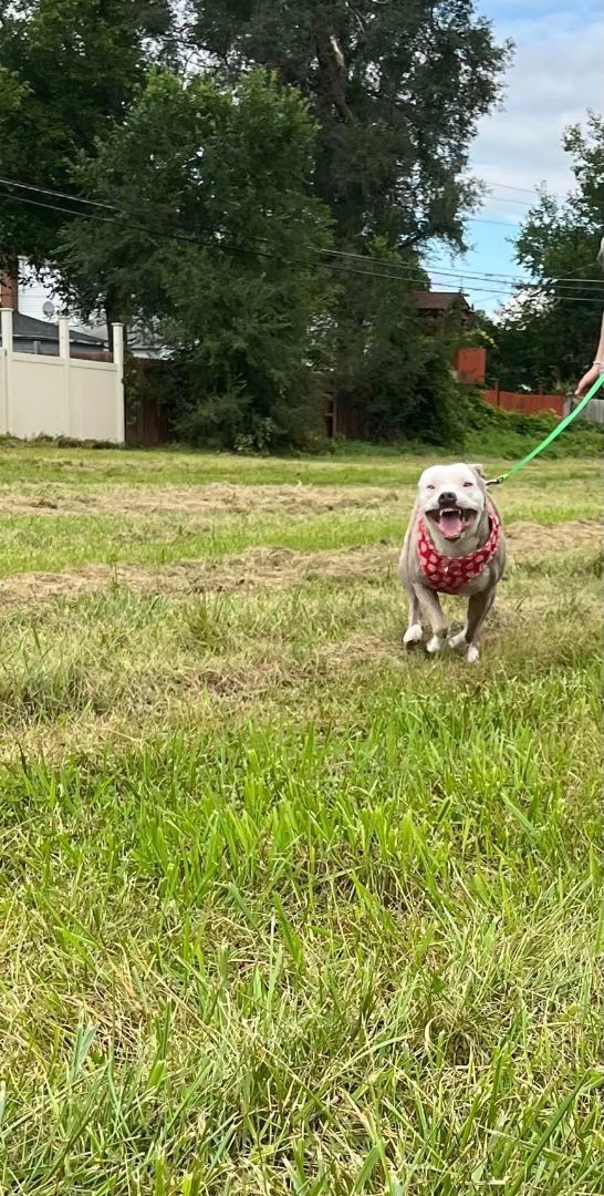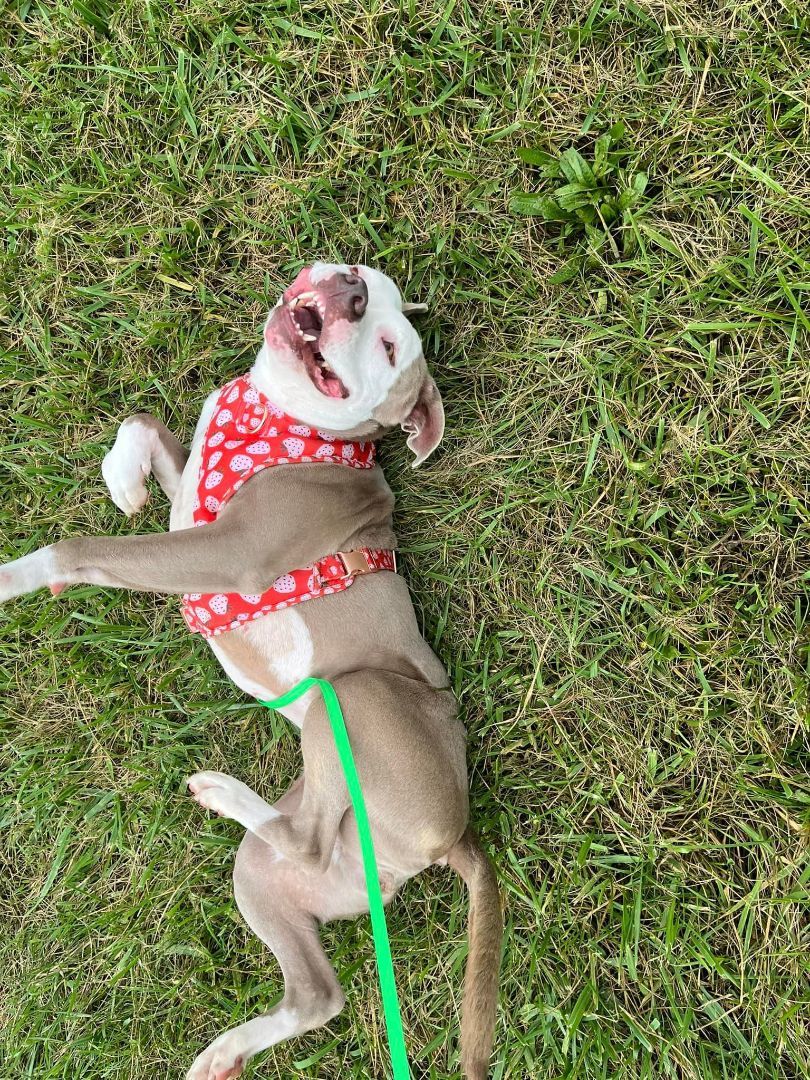 Meet our favorite girl, Moxie!! You’re in for a surprise! This girl wins best award for BEST PITTY SMILE WE HAVE SEEN! Her teeth, and happy smile she gives brings joy to us every single day we have had her. Moxie was also traumatically displaced and has never let her smile fade. We are not kidding, you come down to see her and she will greet you with her star smile and biggest wiggle butt. Moxie is a very mellow, laid back girl who only wants to play when she wants to play. She loves to snuggle up in blankets. Moxie is estimated to be aged between 2-5 years old. She is potty trained and seems to be good with other dogs! If you are interested in Moxie and would like to set up an appointment, please contact us at (313)970-5269. We require meet and greets for all adoptions. See you soon! ???