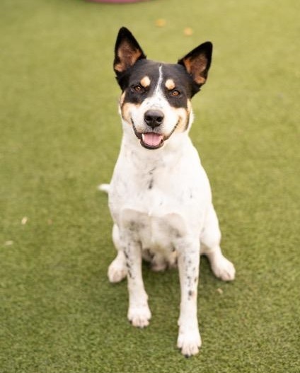 Hi there! My names Lilly, and Im a sweet, confident, playful, energetic 45-pound Australian Cattle Dog/ Fox Terrier mix who was born in November 2017. Dont you just love my red eyebrows as well as my freckled nose and forelegs? Ive got the weight and build of an ACD but the coloration of a Fox Terrier. I make a devoted family companion because Im a good-natured, fantastic girl who gets along with humans of all ages. However I need to be an "only pet-child" since Im not compatible with other dogs and my terrier instincts give me a penchant for chasing cats. My ACD ancestry (if thats what I am as a rescue dog) points to my boundless energy, tireless work drive, and shepherding instincts; my being a sweet, lively, active, and clever pooch hearkens back to my Fox Terrier heritage. All of these qualities make me a good fit as a partner for runners or hikers as well as a participant in dog sports. Im rugged and agile, so Ill need daily exercise to keep me both mentally and physically fit. The last thing you want is for me to get into mischief because Im bored! I train beautifully as long as my owner doesnt passively renege and let me "own" him. Im so well socialized that I was obviously someones pet, but unfortunately I was found as a stray with no identification. It was the first day in the rest of my life when the Good Samaritan who saved me turned to Miss Donna to find me a forever home. I hope that my perky face and big smile have captured your heart so youll arrange to meet me today! Lets go for a walk or a jog. I promise you everyone you pass by will compliment you that "the" perfect dog is your companion! Lilly is updated on shots, spayed, dewormed, microchipped, heartworm negative, and fully trained. Her adoption fee is $250 for dogs older than 9 months. An application must be filled out prior to adoption.