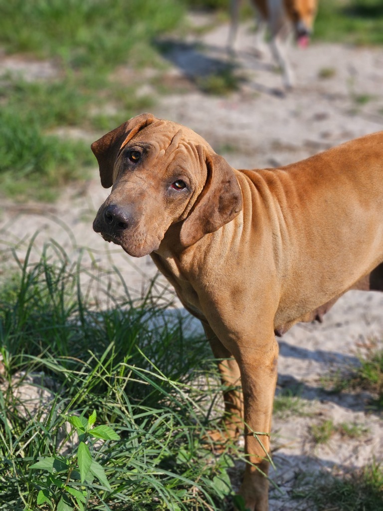 My name is Mylie, I am an approximately 3 year old Bloodhound mix. I am pretty quiet unless I see something that worries me (the neighbor across the street mainly for some reason). Mylie was picked up by Wayne County AC in Jesup Ga extremely pregnant and with what appeared to be some gunshot wounds on her face and neck. She was scared to death and not healthy and due to that quickly lost all but 5 of her puppies to fading puppy syndrome. But she raised 5 very healthy and happy babies who have now all found homes. Mylie is extremely sweet and learning to meet new people without fear. She actually came up to our family friends and let everyone pet her and was excited to meet all 4 of them! She is still having a rough time learning to walk on a leash but we are working on that. She will need a fenced yard for that reason until she becomes more confident. She is just the sweetest girl who deserves what shes never had, the safety and love a family provides. Her skin is buttery soft and she is the most gentle sweet girl ever. If you think Mylie will be a good fit with your family please fill out the application at sgerinc.com to get started. Mylie is spayed, utd on vaccinations, microchipped and on slow kill hw treatment. As long as taken out regularly she is perfectly house trained but gets scared being confined to a crate. She will learn. Its not bad to be in her crate but it will take time due to her past.