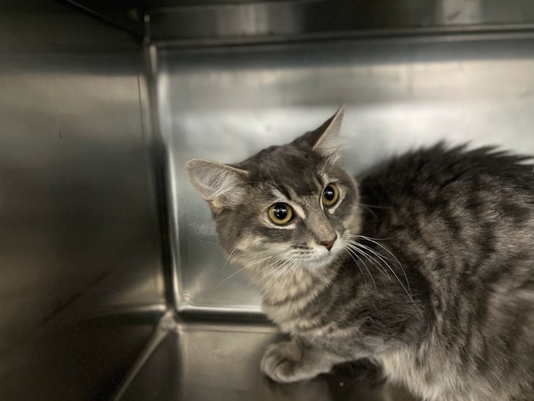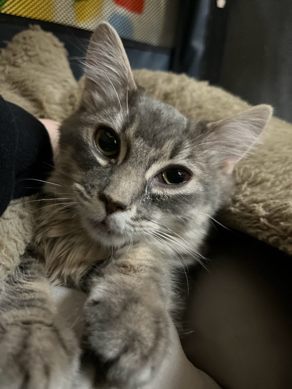 Cranberry is a 7 month old female lilac tabby domestic long hair kitten. Cranberry is a sweet girl who is looking for someone calm and loving to come into her life. She loves to snuggle up with her mom, Sinead, especially when she is feeling a bit insecure. Once she knows you, she will show signs that she wants your attention and will come sit near you. Cranberry would do well in a home with Sinead A# 10301, and would be fine with other cats and children. She would do best in a home without dogs. To apply for this pet on Adopets, click the Adopt Me button below their profile picture. To apply for this through PetFinder, please visit www.ucspca.org/how-to-adopt/available-cats/. Please know that putting in an inquiry through PetFinder is NOT putting in an application. You must apply through our site on Adopets to adopt this pet. Primary Color: Grey Tabby Weight: 5.08lbs Age: 0yrs 7mths 1wks Animal has been Spayed