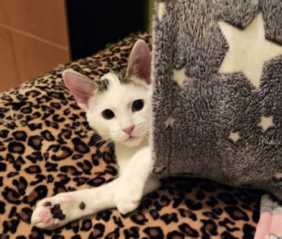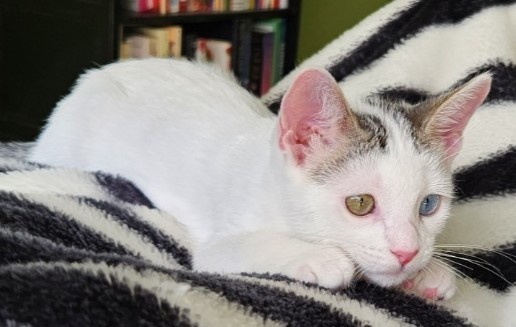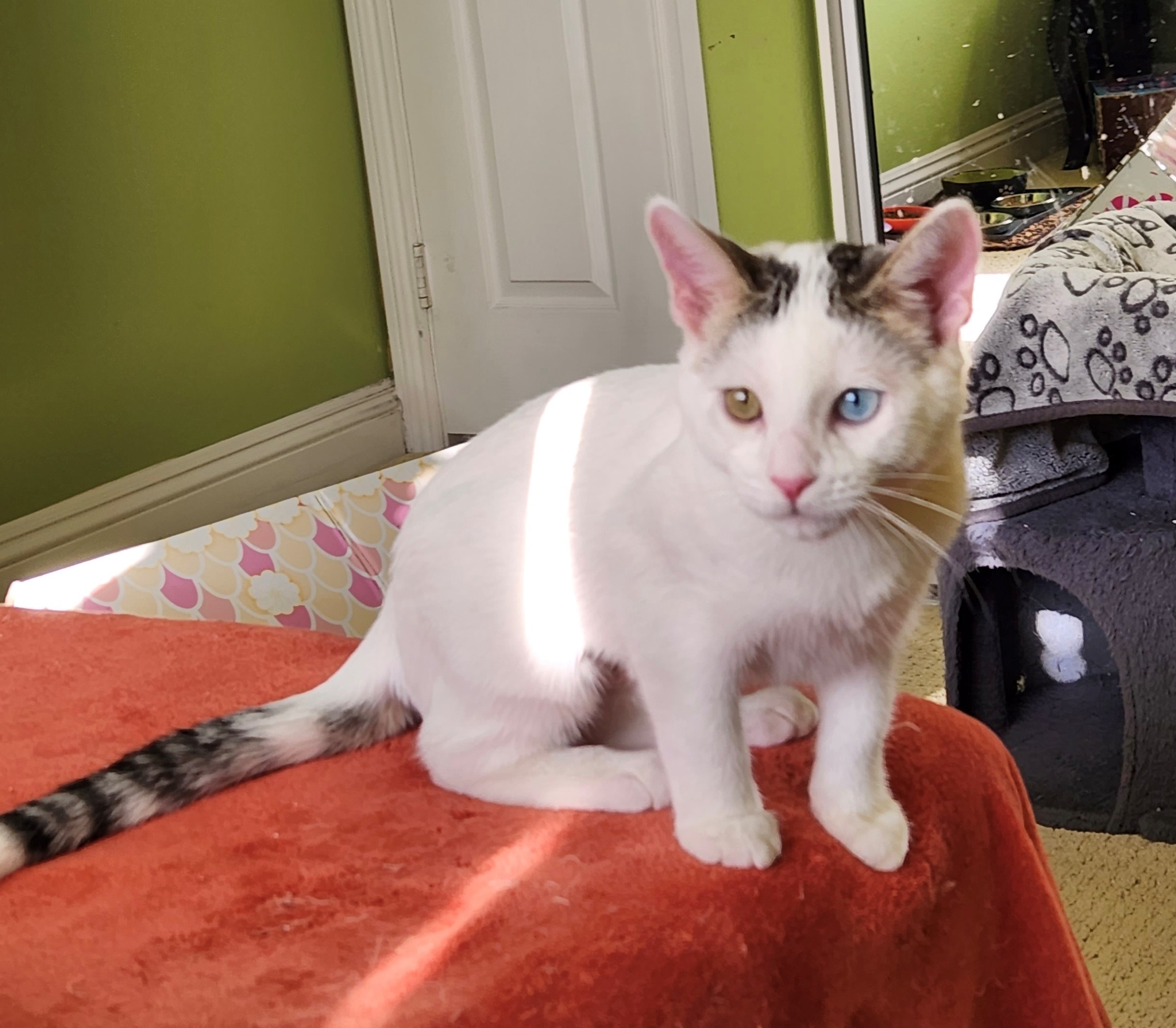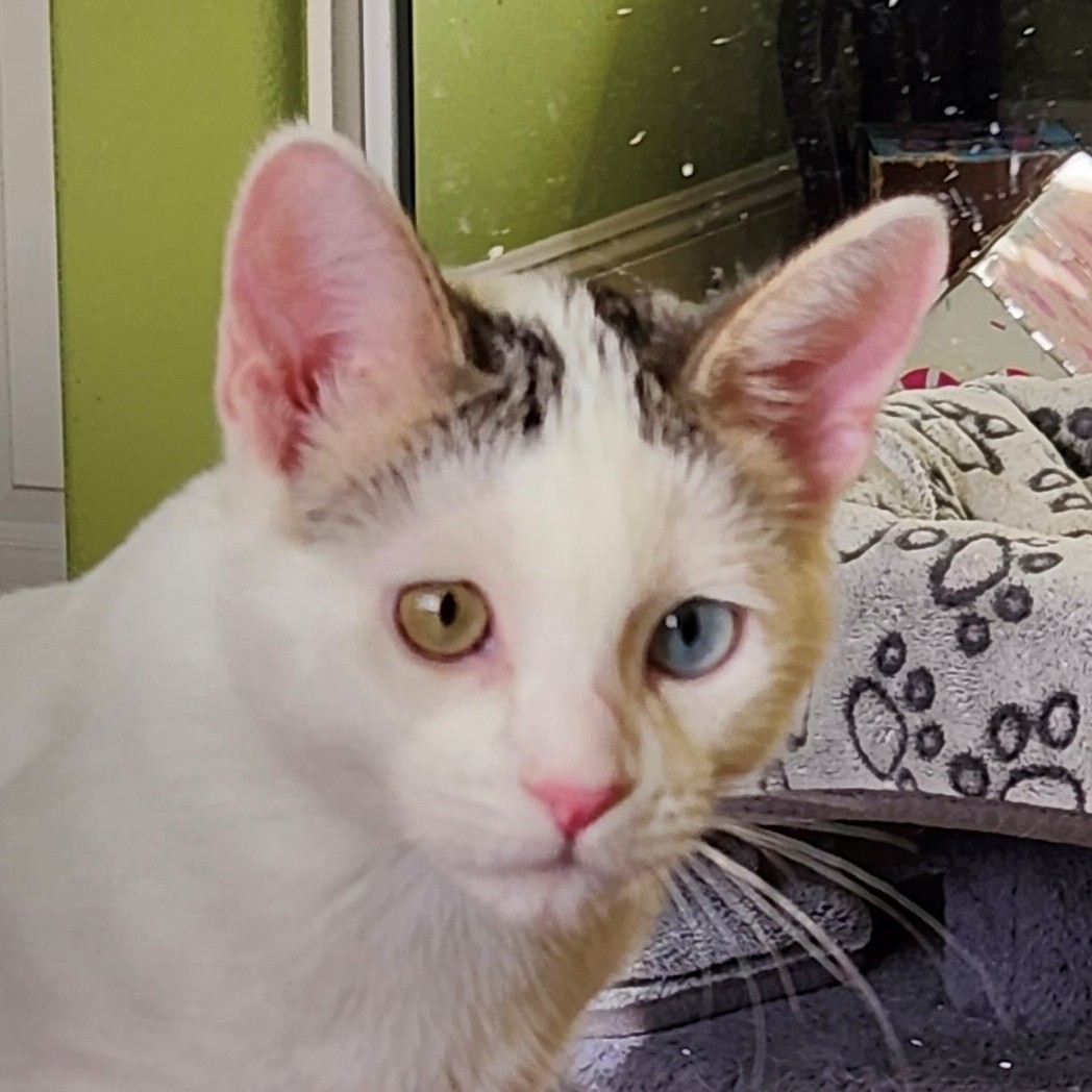 Meow and hello. My name is Abby. My foster mom took my 2 sisters and I into her home at just 2 weeks old. She had to bottle feed us so she really is like our mom. She used to refer to me as the Devil Kitty but now she says I’m a little love bug when I want to be. I’m sweet and sassy all wrapped up in one little kitty. I earned my nickname for the mischievous twinkle in my mismatched eyes; one as green as an emerald, the other as blue as the sky. I’m a true adventurer at heart, finding joy in every corner of my foster home. My playful spirit comes to life with boundless energy, making me a master of feline acrobatics. No feather cat wand is safe when I’m on the prowl. Wrestling matches are my favorite pastime, especially with my sisters Callie and Lily. Despite my spirited nature, I have a soft side too; I’m quick to purr and I love a good snuggle session with my foster mom. My unique charm and dynamic personality make me the purrfect addition to any loving home. If youre ready for a daily dose of laughter and love, I’m the devilishly delightful companion youve been searching for. Please consider bringing along one of my sisters Callie or Lily. To learn more about me, please contact my foster mom Tammie at tammie@thevbas.org.