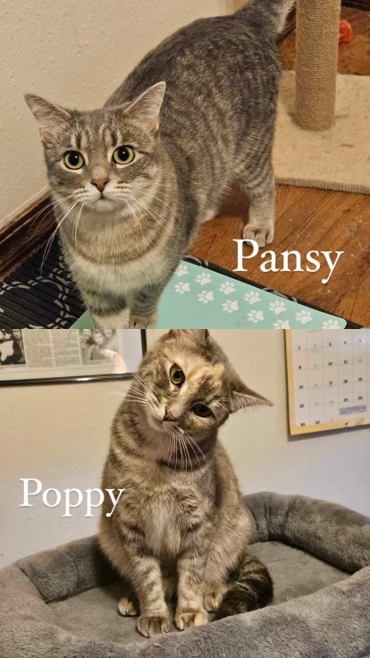 Meet Poppy and Pansy! This sweet mother/daughter duo came to us when their owner passed away unexpectedly. Poppy is 2 years old while her daughter Pansy is 1. Both are shy but sweet once they warm up. They both love other cats, are super fond of toys and can’t get enough treats. Pansy is more shy than her mama, but once she’s comfortable she’s an absolute love! Poppy and Pansy MUST be adopted as a pair. They are good with adults and older children (may be fine with younger children after they adjust to a new home). Both are great with other cats but are untested with dogs. To apply for Poppy and Pansy please full out an application at freetoliveok.org/adopt