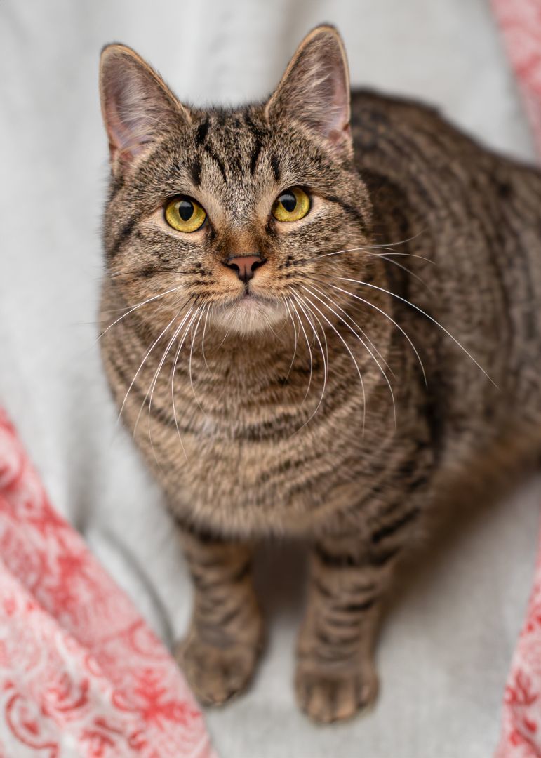 Kusama is a unique blend of friendly companionship, playful energy, and independent spirit. She is about two years old and still has kitten spunk, but is also content to sit next to you and be petted, or just keep you company. The best way to bond with her is through play. Bring out a wand toy and she cant get enough of it! Her hunting instinct is activated as she chases wand toys and catches her "prey", carrying it away to a corner, dropping it, then looking up at you to play the game again. Kusama can be initially reserved with unfamiliar people, so she needs some time to adjust, but after getting acquainted, she rubs against you and melts into your hand for pets. Affection might not be her first move, but once she trusts you, its her middle name! She is cool with other cats, but will also be content to spend time on her own. Her ideal home should provide plenty of playtime, abundant attention, and a gentle, slow approach while she adjusts to new people and new surroundings. She would greatly benefit by living in a home where she can receive consistent love and attention, and not be left alone the entire day. With a little bit of patience, youll have an adorable and affectionate sweetie pie by your side, so discover the many facets of her feline charm by taking her home with you!