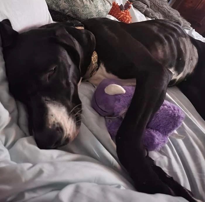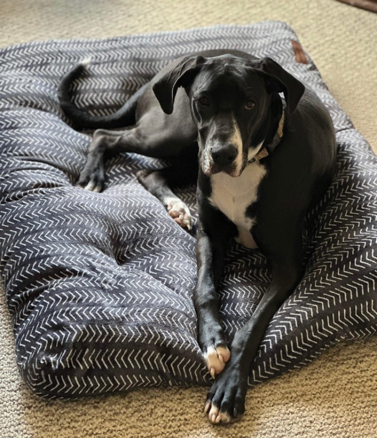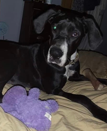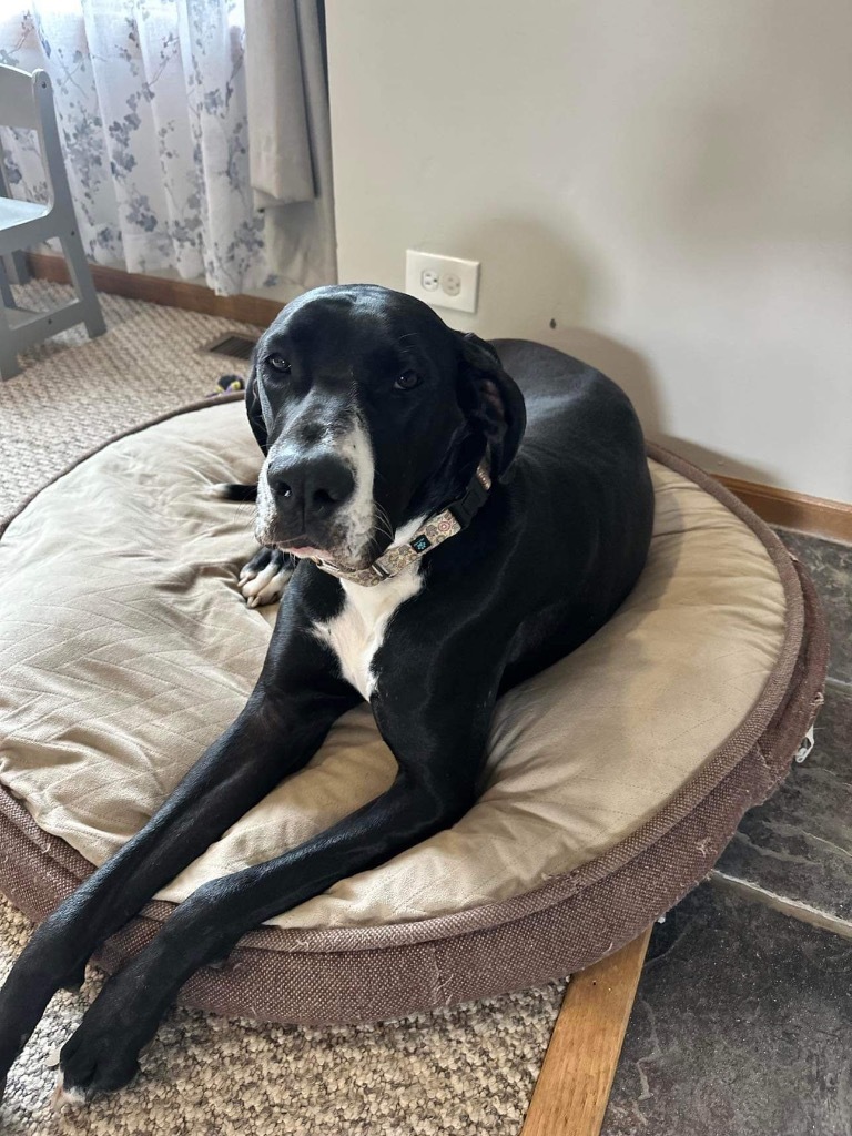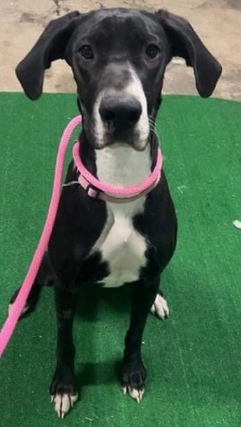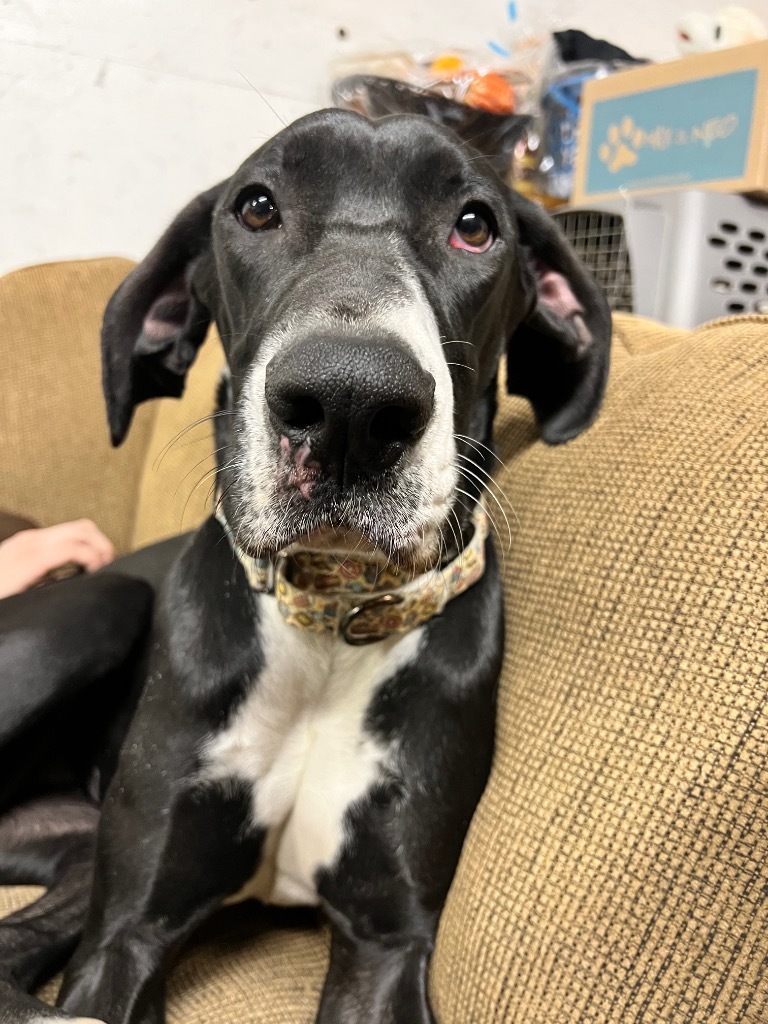 Hi Biggie Paws Friends ! Wed like to introduce you to Chloe. Chloe is a Great Dane, weighs approximately 100 pounds, is about a 1.5 years old and is waiting in central, WI for her fur-ever home. Due to her rough start in life, Chloe can be a bit cautious around new people. Once she is settled and comfortable in her surroundings she will "pick her human" and become a devoted follower ...focusing on where and what her human is doing. Chloe is NOT a fan of car rides or hats. If she meets someone in a hat she will bark at them until they take the hat off. This sweet girl is really just an affectionate, well mannered pup. She will come when called, she does NOT snatch food off the counters or away from the younger humans, she waits patiently for attention and she LOVES to cuddle and have her ears scratched. Chloe also has a playful side. She LOVES to play with her toys and be silly ...she even has an ear that flips over when she plays hard. Chloe LOVES younger humans, she plays well with other dogs, shes curious about cats, but probably doesnt realize shes just a tad bit bigger than they are, and may get a little too rough when playing with them ...so a no cat household might be best. Chloe is potty trained, / leash trained, / crate trained / and LOVES to be outside. She would probably do best with a fenced in yard. She sleeps through the night in a doggie bed in her humans bedroom, or a doggie bed in the living room. She LOVES when shes invited into her humans bed to sleep ...or for snuggles. Like most large breed dogs, Chloe has had a gastropexy (bloat prevention procedure), she is spayed, microchipped and up to date on all of her age appropriate shots. Chloes adoption fee is $850. If youd like to be considered to adopt Chloe, please fill out an adoption application under the link directly below. www.biggiepawsrescue.orgDATCP # 494550