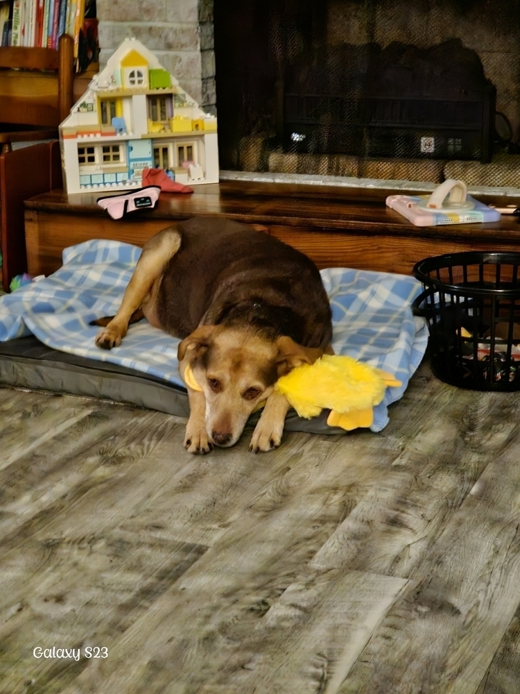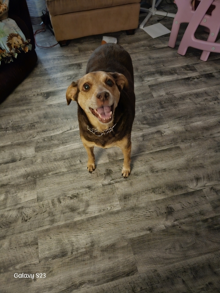 Hi...Im Dobby (although my foster family also calls me Dobs and Dobber) and Im about 6 years old. They tell me that Im the goodest girl ever! My foster mom says Im realy good at sit and that Im getting very good with down and stay.....were working hard on "wait"! I love squeaky toys and also like it when the humans throw a ball for a bit....Ill bring them back for a while but Im not a hard core retriever. I like to give kisses on the hand or sometimes on the humans nose but I absolutely LOVE belly rubs! I have been known to come up and use my paw to grab your hand to get some rubs and scratches. If you like to relax on the couch I am more than happy to join you or just lay on the floor by your feet. I am very house broke and will tell you when I need to go outside...foster mom tells me Im a great squirrel chaser! At night I always help put the kids to bed and then I snuggle in between their beds to sleep. There are cats in my foster home and I do like to chase them once in a while but its only to play and I get along fine with other dogs too.