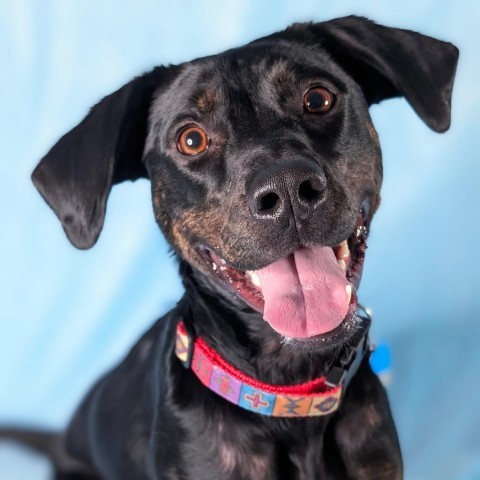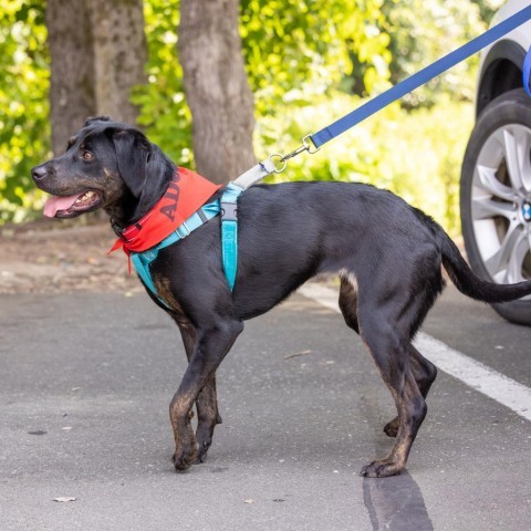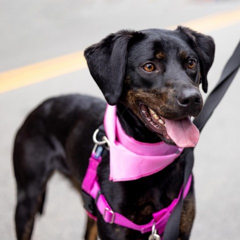 PERSONALITY & BEHAVIORS Polly Pocket is an affectionate, sweet, loving girl who adores all people and dogs alike! See her videos with dogs she had never seen before! And see the pic with her grooming another dogs ear. Polly was 2 years old in mid-September. If there are children in the family, Polly would do best with older children because although she adores little children, she wants to give them (and everyone) kisses (which arent appreciated as much as she wishes!) and may knock them over. High energy, she needs an active family for daily brisk long walks. Her ideal home would be where someone is home for company (she can go 4 hours between potty breaks), another young dog to play with, and a 6-ft privacy fence (as she can fly over a 5-ft picket fence). Polly would be perfect for agility training! Couch cuddles and a bedtime story are always welcome. She adores going for walks and does well on leash. Such a friendly girl, Polly is always thrilled to see dogs and people on the street and welcomes them to come right up to her to say Hi. Wag, wag, wag -- Oh, boy, another new friend to meet! She will sit for treats on walks. Very smart, she has learned Sit, Down, Roll over, Shake, Come, Crate, Wait, Stop, Lets go out, Time for bed, Go back to sleep, Off, Treat, Watch out, Look at me, Leave it, Back up, and Drop it. She is house-trained and crate-trained, and will go right into the crate when given a treat and often just on her own. Polly lets you know when she has to go out. She loves her Benebones, marrow bone, and peanut butter Kong! Polly is very patient when given a bath in the bathtub and doesnt try to jump out! She loves car rides and also waits patiently until you unhook her to get her out. HISTORY Polly Pocket was found as a stray by a Good Samaritan. HEALTH Polly Pocket is up-to-date on vaccinations, microchipped, spayed, and heartworm negative. PHYSICAL Polly Pocket is mostly Plott Hound, with a shiny black coat and brindle markings on her face, chest, legs, and butt.