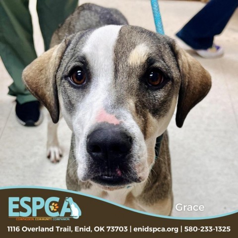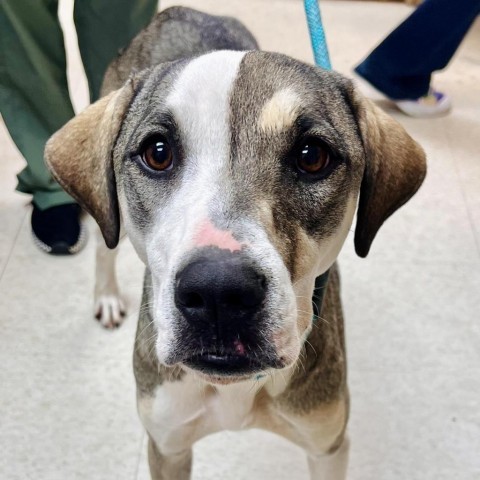 Grace can come off as shy at the start, but she quickly warms up and is the sweetest, most gentle girl. She loves kids and willroll over to get belly rubs from them. She has a very laid back personality and she is still adjusting to kennel life here. She will sit for treats once outside of her kennel and learning to walk on a leash. Come in for a Meet N Greet or put in an application today!