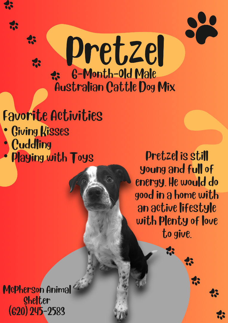 This is Pretzel. He is a six-month-old Australian Cattle Dog mix. He is a super loving puppy that enjoys cuddling with people and playing with toys. He is full of love, and enjoys giving kisses to people. His favorite activities are playing with different toys, spending time with people, and exploring new places. He is not yet potty trained, but most of the time he keeps a clean run. If there is another dog in the home a meet-and-greet is required. Pretzel is current on his Distemper, Parvo, and Bordetella vaccinations.