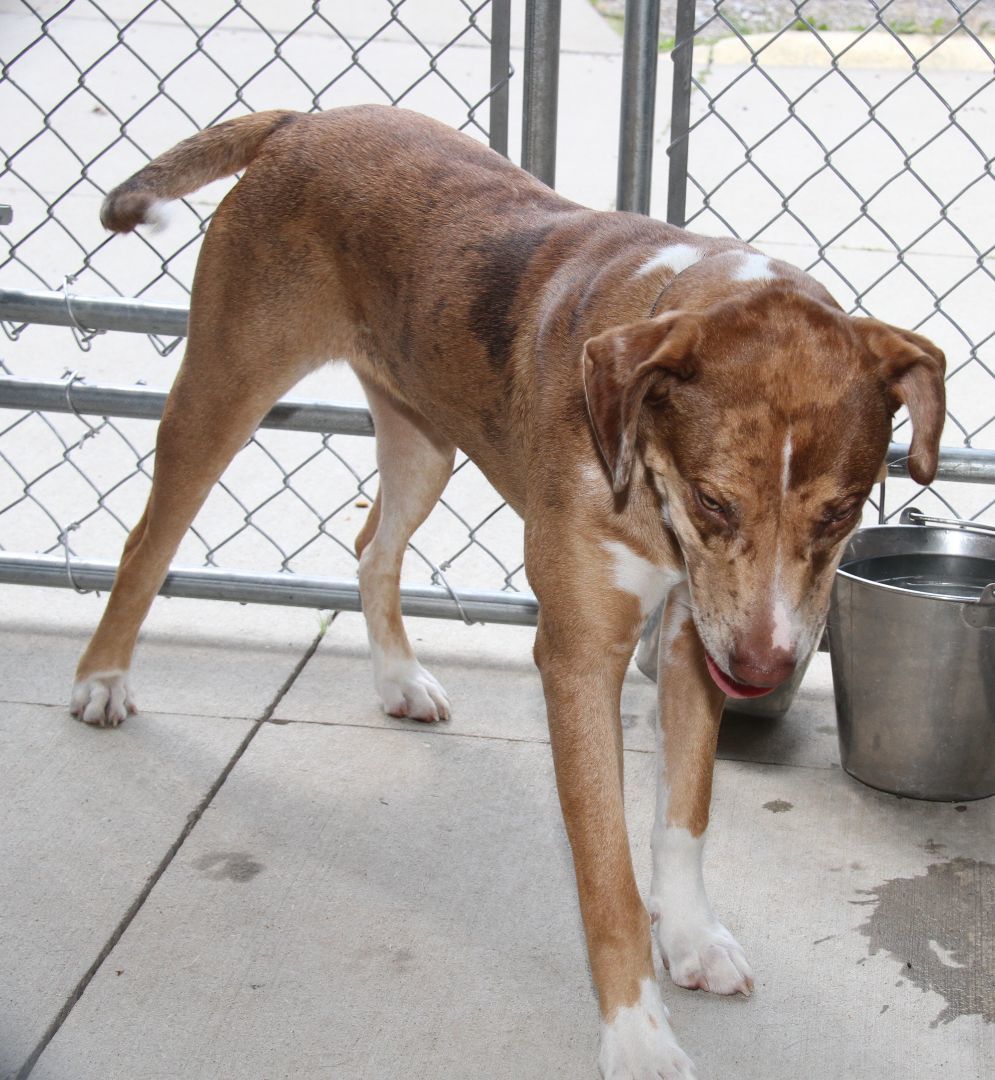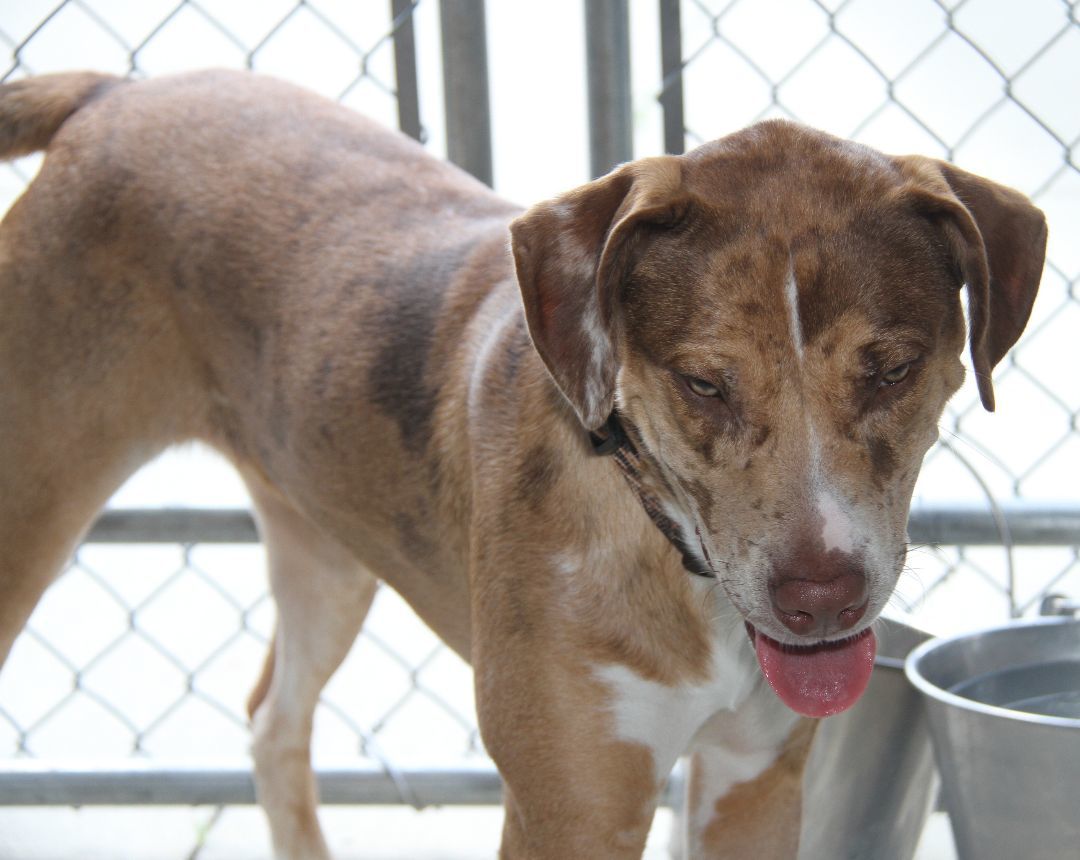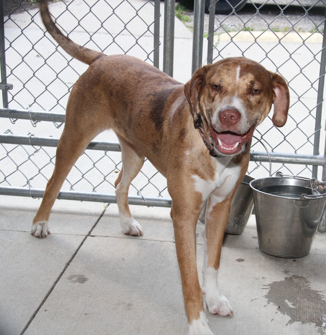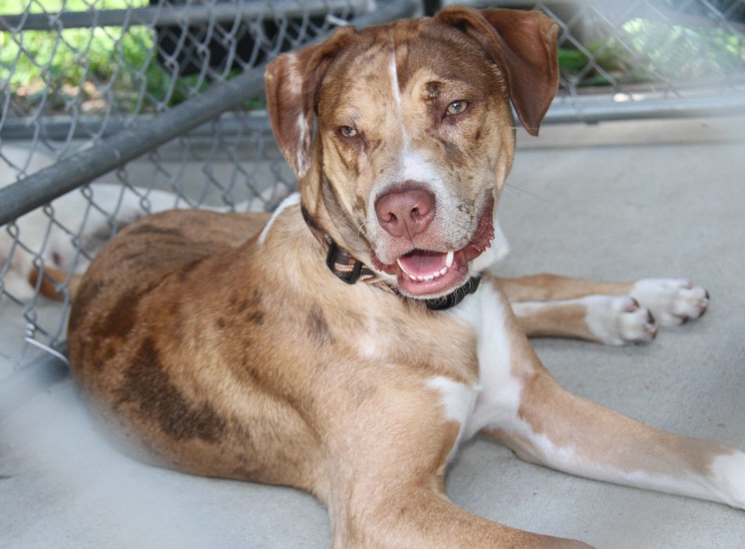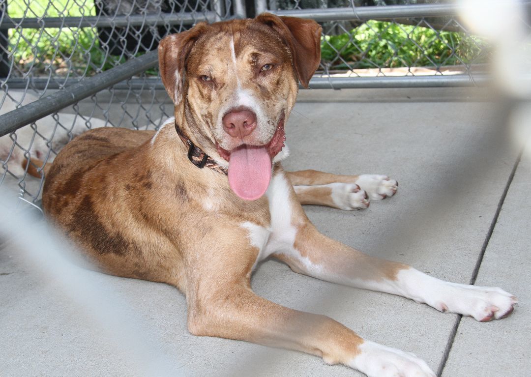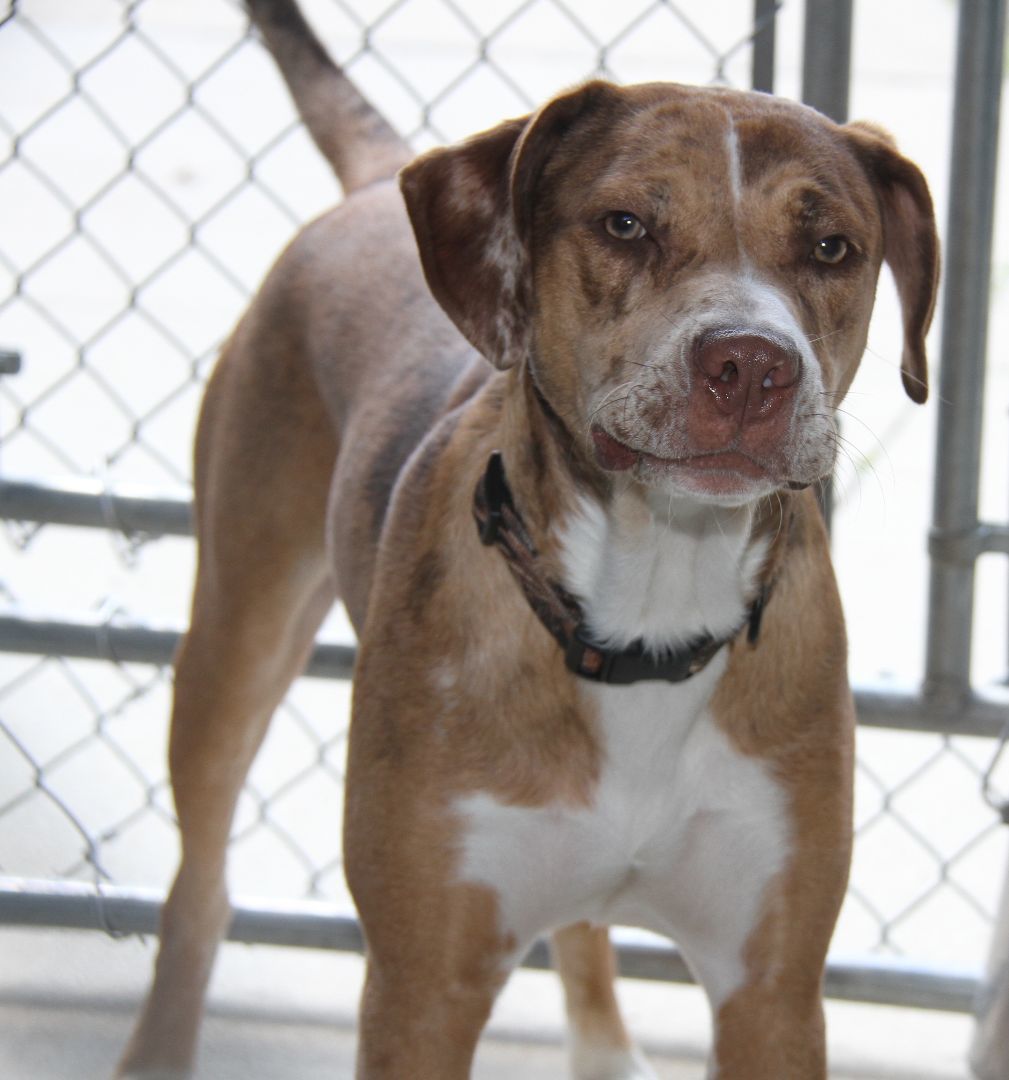 Bradyn is a 1-1/2 yer old male (possible) Catahoula Leopard Dog was brought to the HSOV on August 4, 2023 by a Good Samaritan who had found him on Colegate Drive in Marietta Ohio. Bradyn was wearing a nice collar which complemented the color of his beautiful coat but, unfortunately, there was neither an id tag nor a dog tag on the collar ... And he was not microchipped. Bradyn has a brown/tan short smooth coat in a merle pattern, white markings on his chest/paws, a long tail, and a beautiful face with a tan mask, amber-colored eyes, a liver-colored nose, a splash of white on his muzzle, and large floppy ears. Since the temperatures were in the low-90s on the afternoon of August 4th, the paparazzi decided to take photos in the outside kennel (which was shaded by large tarps) instead of in the bright sunshine. Bradyn was a little suspicious of the peeping Tom who was creeping around the kennel and snapping pictures through the fencing. So he initially sounded the alarm by barking, but later realized that the paparazzi (our photographer) was no threat so he relaxed and just looked at the camera. Bradyn weighs 58.2 lbs. In compliance with the Ohio Revised Code, Bradyn will be held for three days so that his family will have an opportunity to reclaim him with proof of ownership.
