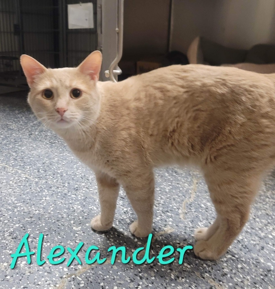 Alexander is about 2 years old. He is friendly but can be shy. Alexander gets along with all the cats in his room hes the "popular guy" He would need an adopter that would allow him time to come out of his shell. When he is out of his kennel, he likes to sit in the window and watch the birds outside. Hes been at the facility for about 8 months and is ready for a home of his own. He is completely vetted. Apply by going to fetchingfureverhomes.org