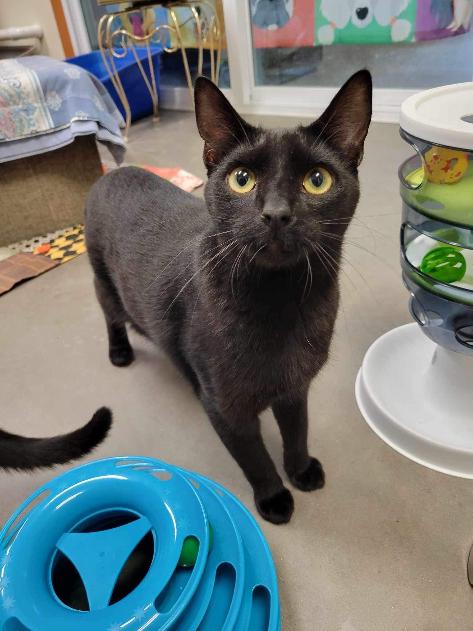 Spook is 1.5 years old, a black DSH male. He is playful and active, and enjoys the company of another playful cat. Applications: www.catkinsrescue.org