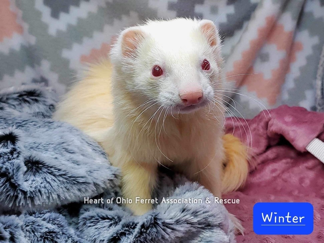 Hi, my names Winter! Im of course the beautiful albino boy, and Im about 5 years old. My brother, Riley is the sable fellow and he is 4. Im a very docile boy, very sweet--I love to be picked up and held, and even nap next to you. Riley is a bit more of a spitfire and can get a bit nippy when playing. But he also loves giving and receiving kisses. Mom is training him not to nip so much and hes doing better. We are on the older end of adulthood, but despite our ages we have a lot of energy and love left to give to a new family. We are both healthy and dont show signs of our age. We can go to a new home together OR if there is a very special family out there with tons of room, we would LOVE to be adopted as a group of 5 with our siblings Raccoon, Bandit, and Baby! We are up to date on our distemper vaccinations, and our adoption fee is $175 for the 2 of us together. **Winter & Riley are staying in St. Marys, Ohio. We do not ship ferrets** -->If you are interested in adopting, please fill out our adoption application here: https://docs.google.com/forms/d/1LyYKIfGZHYOgIW4hJP6bmzYAkEBcCf8pbW8RIQVxWTE/edit?usp=sharing_eil_m&invite=CNLWmOAH&ts=6323b99c