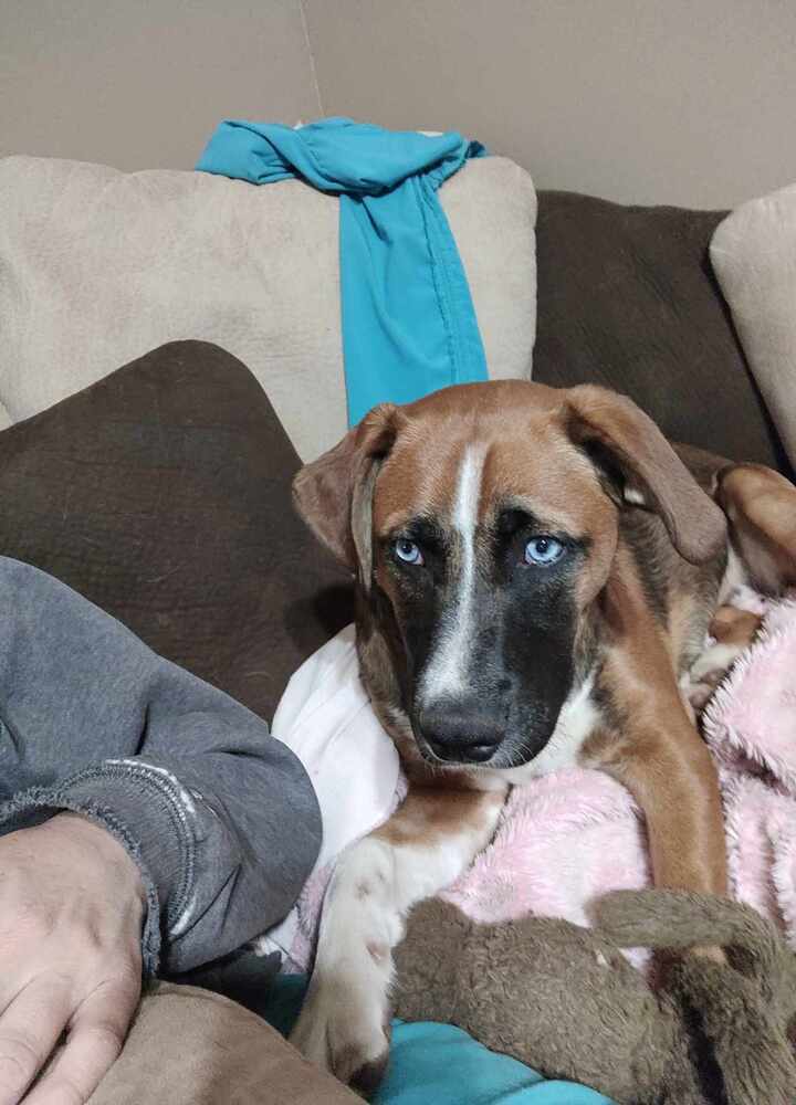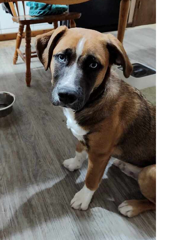 *Courtesy Post* We took in a 6 1/2 month old pup from a situation to find him a forever home. He was tied short, muzzled to keep him from barkingand there was a shock collar involved, so you can do the math. Neutered, up to date on everything and microchipped. Hes a heinz 57 special including spaniel, Shiba Inu, and looks to have some boxer as well. He is one handsome boy with those ice blue eyes and his coat is silky soft. Hes a total loverwiggle body and all. He likes to sleep with you. He will lie across you and chew on a toy if youre sitting on the couch. He eats up praiseand treats! We are guessing he will be around 60 pounds when done growing.We have only had him for less than a week. He is a snuggly guy at night and a ball of energy by day. He has the ultimate zoomie attacks. He will need either a fenced yard or a country home so he can do some running. We are working on potty training which is better everyday with a routine. He is absolutely wonderful with people and I think he would be great with kids. His only undesirable vice that I see is that he was not socialized with other dogs before and wants to rule the roost and get his way with other dogs... aggressively at times. He will charge and take a toy away and start a fight that he wont back down from. But the rest of the time he gets along with our blue heeler and malinois fairly well and they lick each other. If hes the only dog, well, that would be no problem. Hes gentle and affectionate to people and loves attention. He is definitely a one of a kind! He is residing with his foster family until the right person/family is found. If you are interested in giving this sweet boy a loving home, please fill out the adoption application at fetchingfurverhomes.org. He can go for a trial stay for a week before finalized. His rehoming fee of $250 will be donated to Furever Home Inc. animal shelter.
