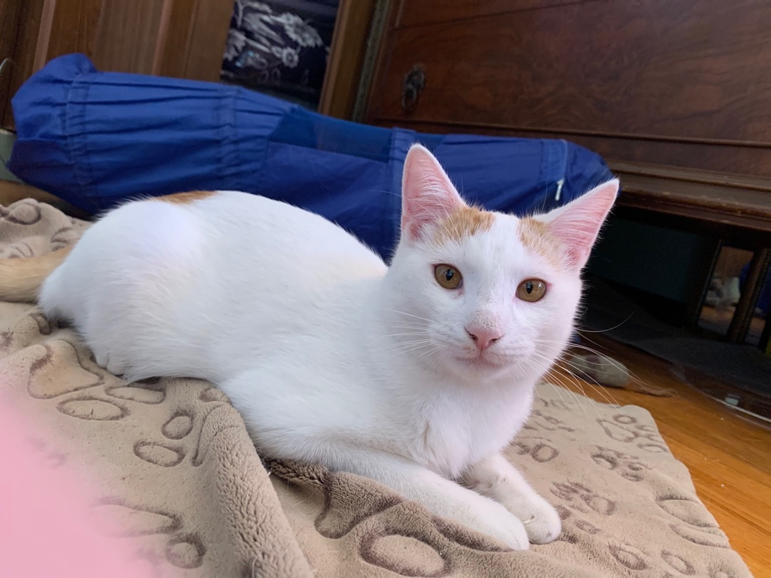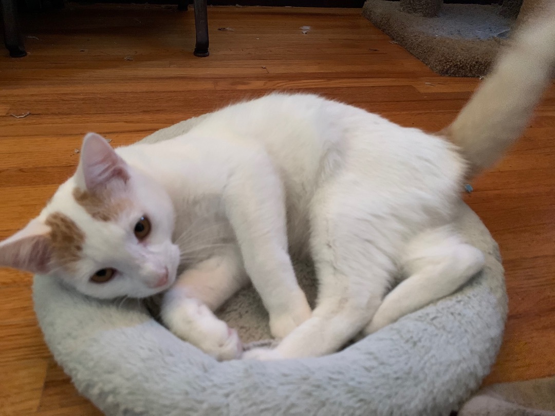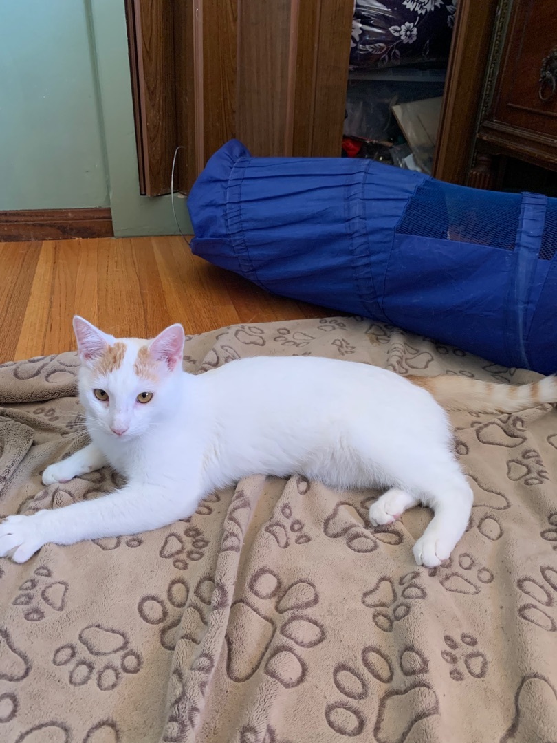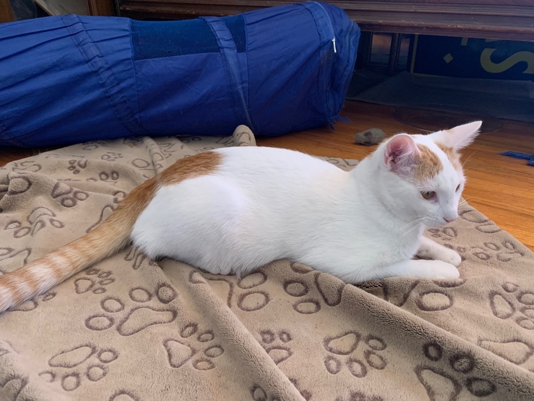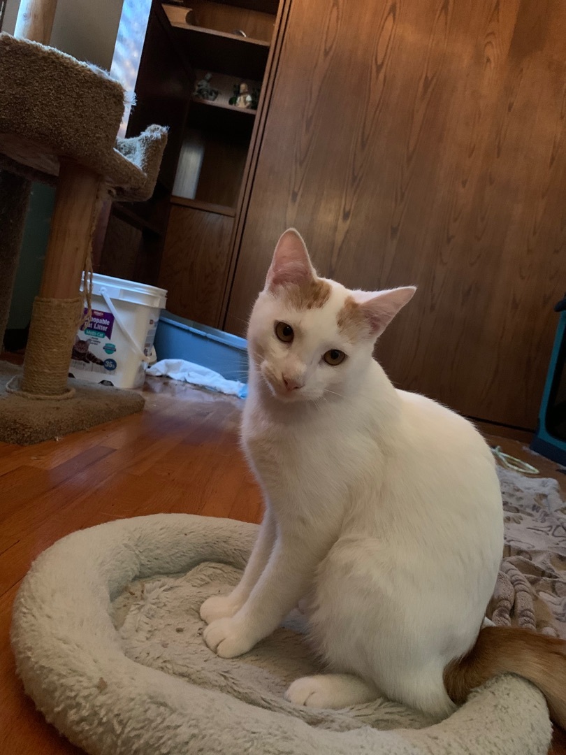 DOB: 1-1-22 Creamsicle is very sweet. He is initially shy but once he warms up he purrs when you pet him. He loves to sit by people and watch them. He doesn’t like to be held much. He would rather sit next to you and get a chin scratch. He loves string toys. Qualified applicants must already own another young cat or kitten or be interested in adopting two kitties.