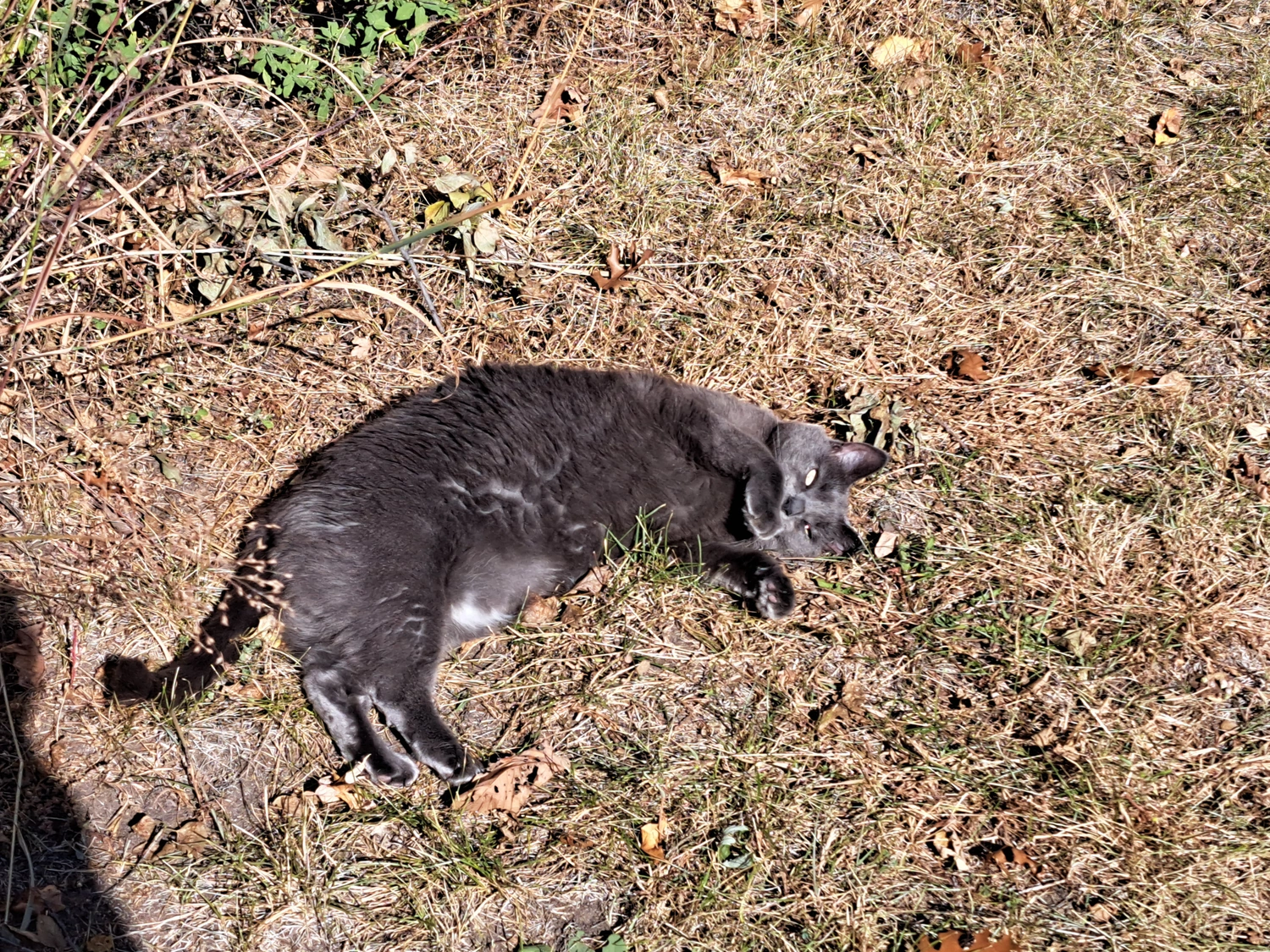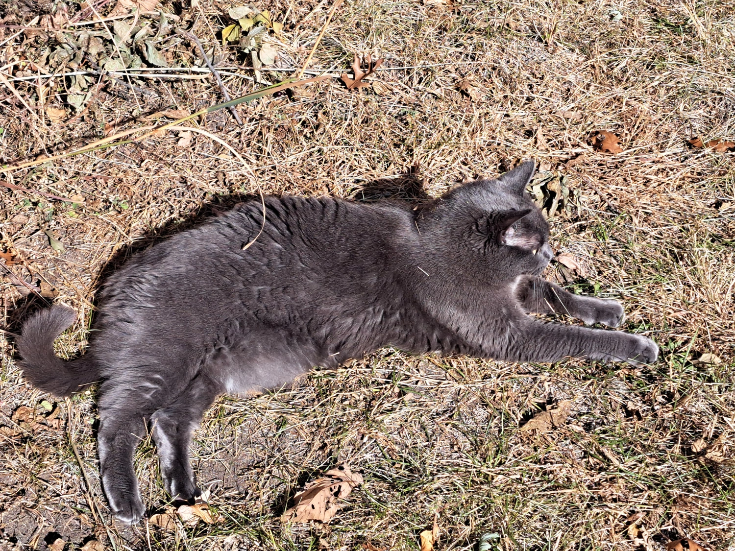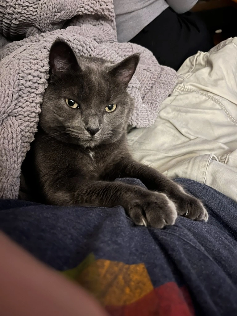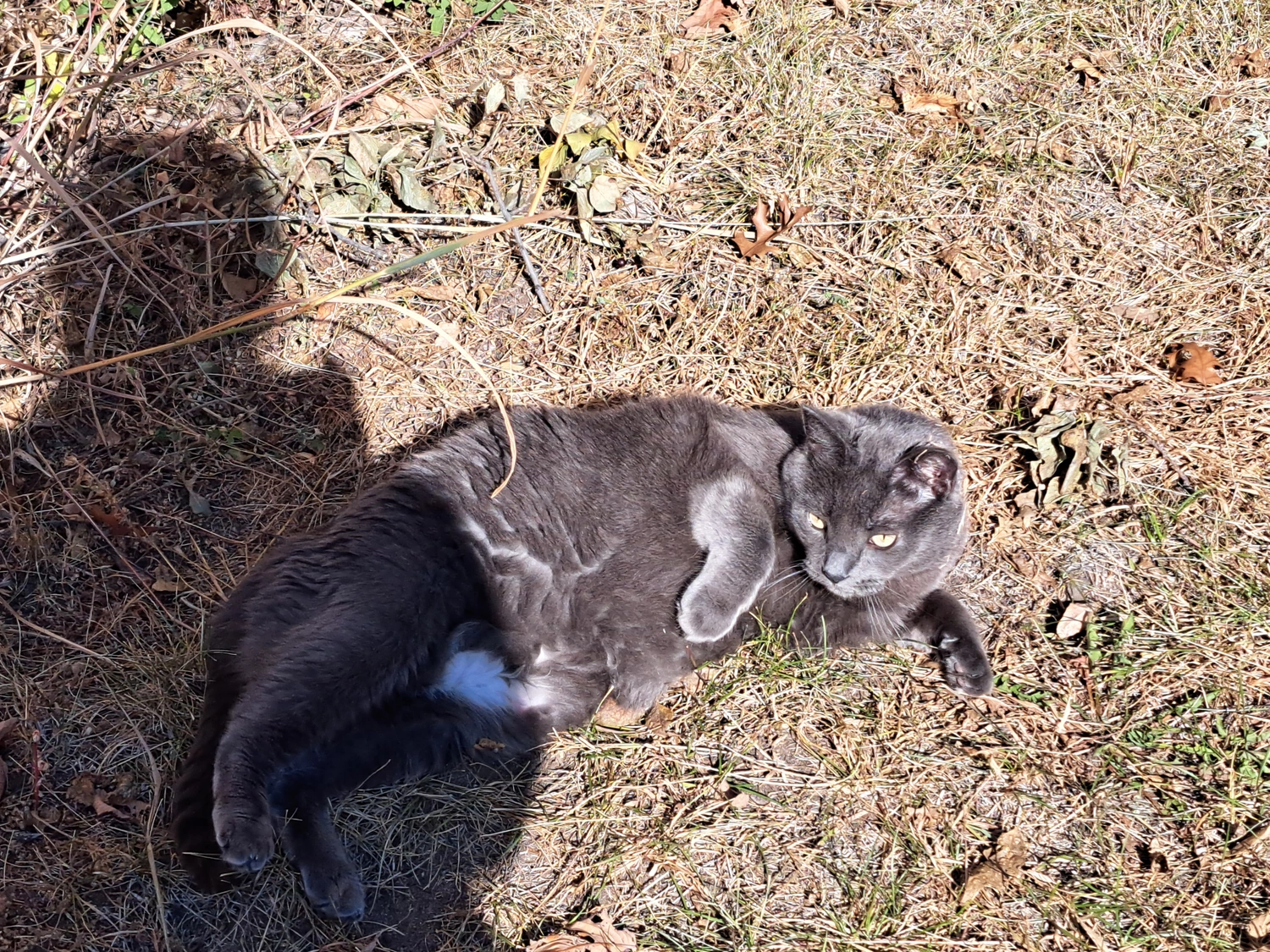 She's very people friendly and has a whiney meow. She is about 12 pounds, about a medium size, but round. Her fur is medium length.