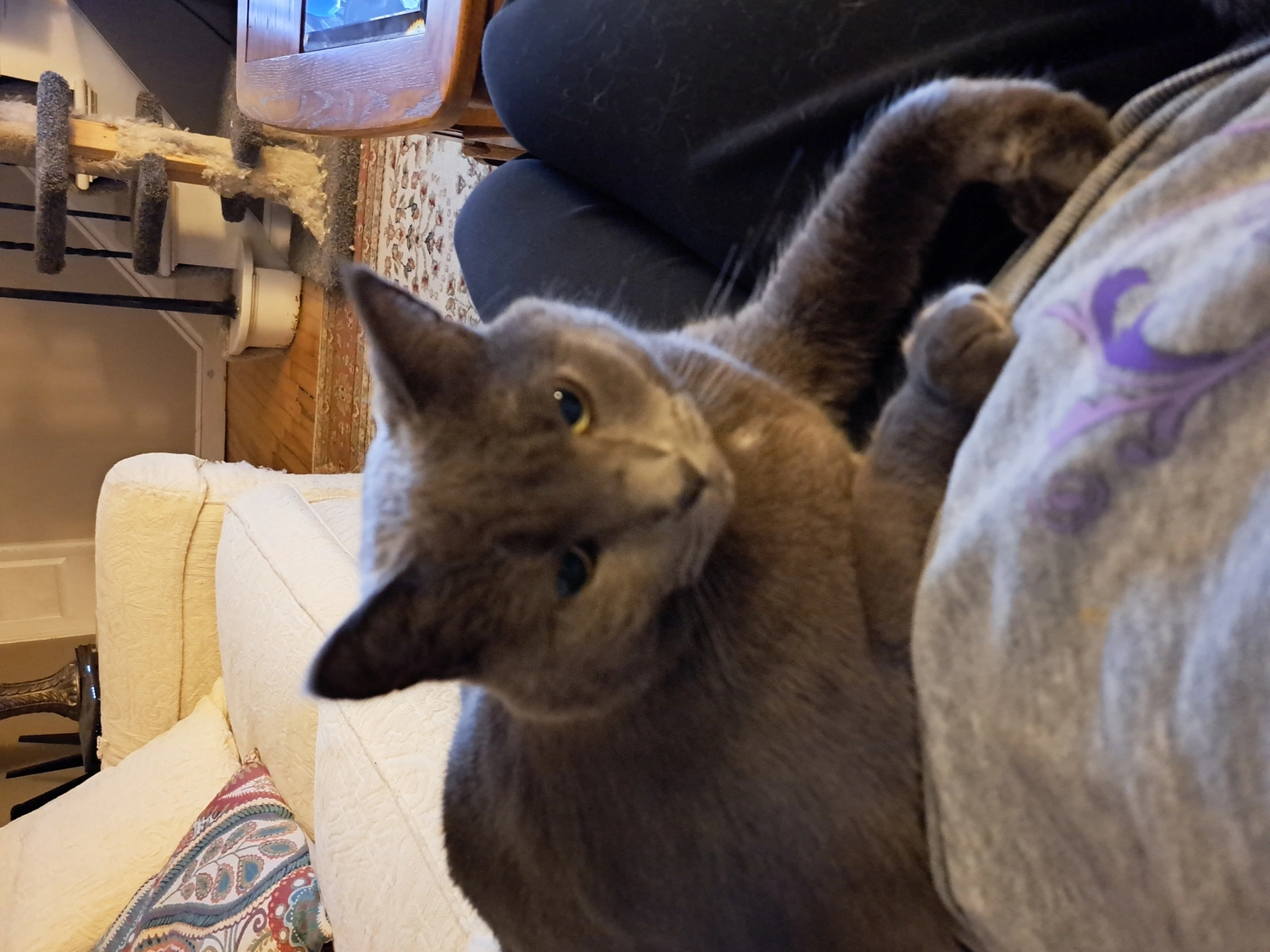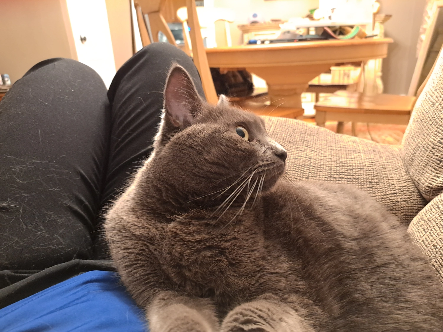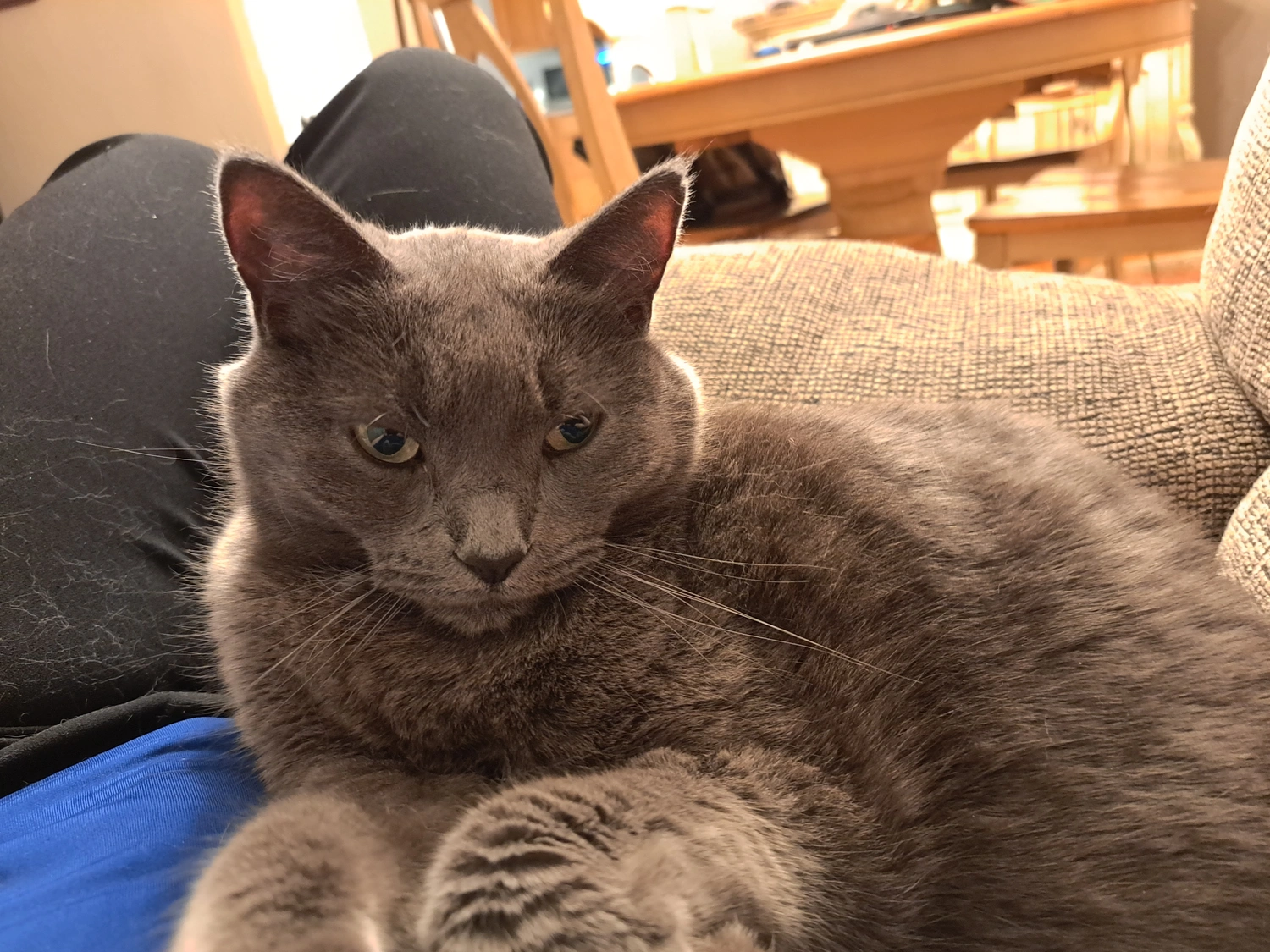 She's very people friendly and has a whiney meow. She is about 12 pounds, about a medium size, but round. Her fur is medium length.