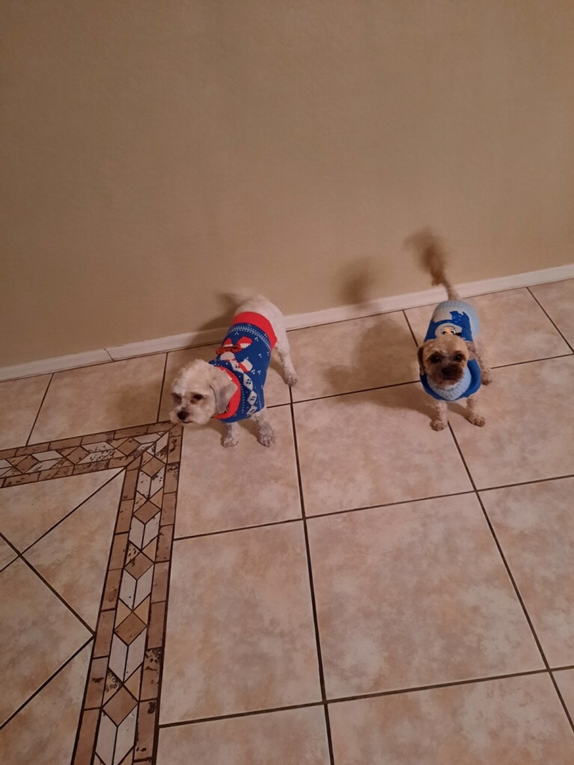 Both of my dog was wearing their christmas sweaters and a pink callur.
