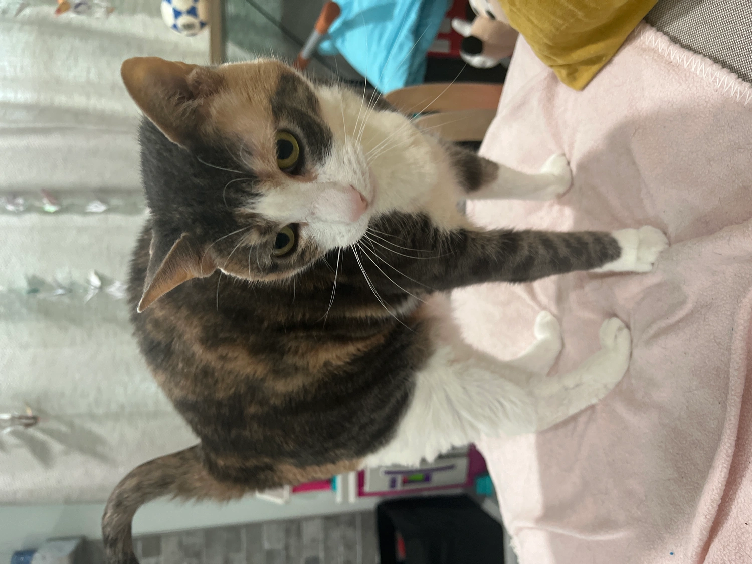 Her tail has a wide base but tapers to a sharp point, and she has ‘mask’ lines on her face.
