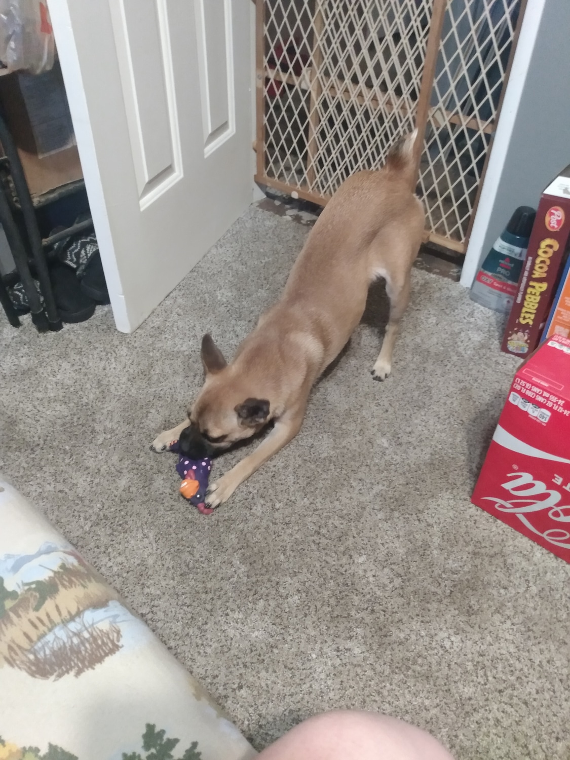 She has long deer like legs, is very friendly and gets extremely excited when she see's children. She has a high pitch bark that almost sounds like a yelp. I need her back home she is part of our family n our family isn't whole without her.