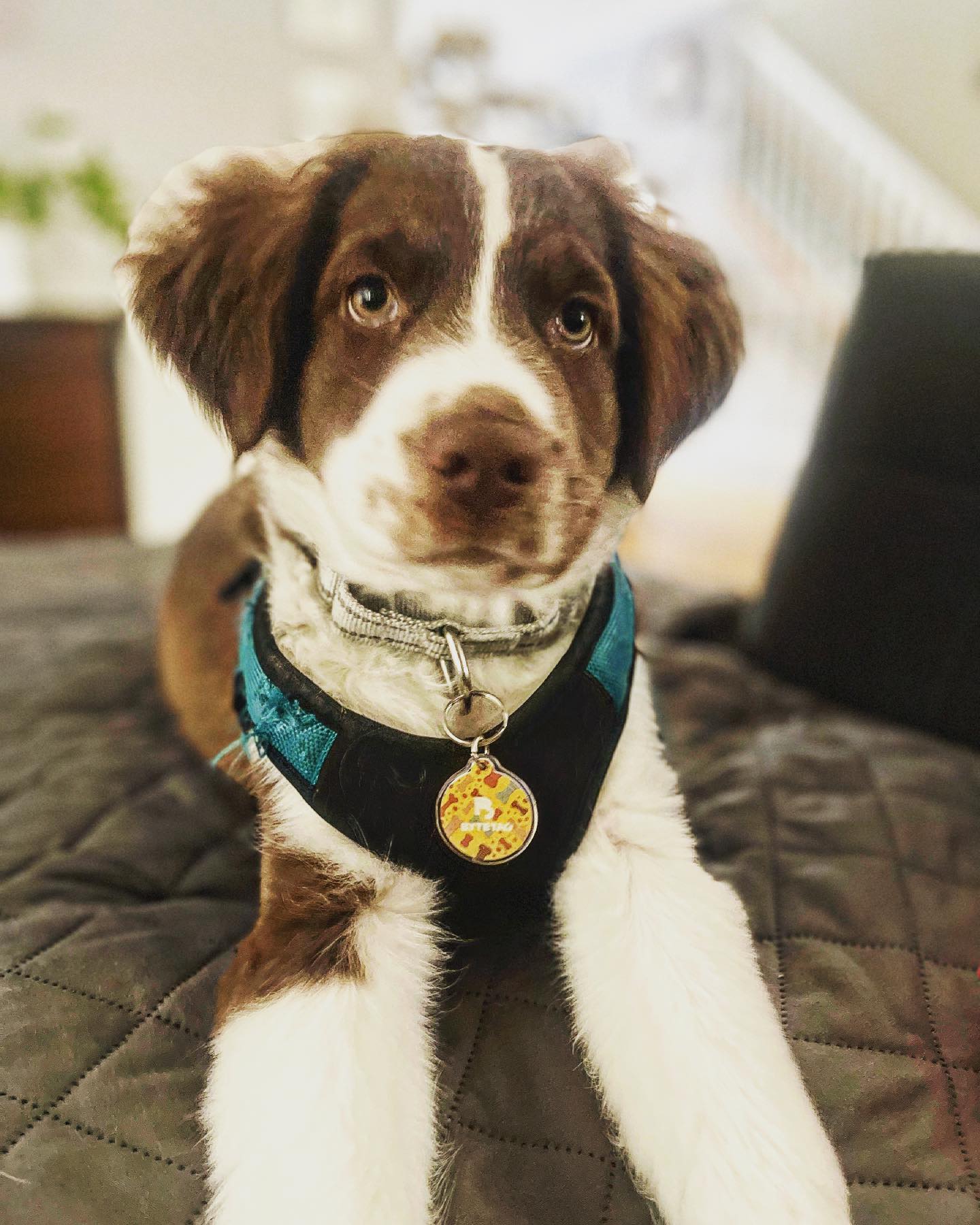 Springer Spaniel, Husky mix. She knows her name, Mabel, and is friendly and calm.
