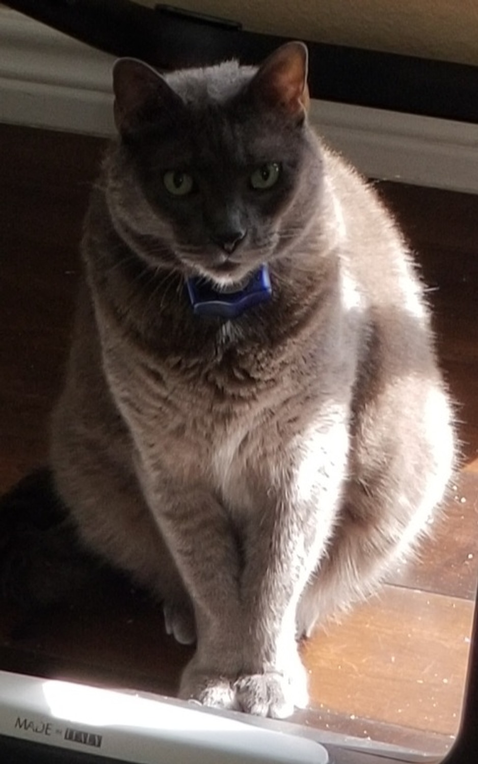 Bauer has a gravely meow. He has a microchip but I do not have the number. He has a white spot on his chest and should have an invisible fence collar. He was 11.5 pounds when he went missing. He is skinnier than his picture.