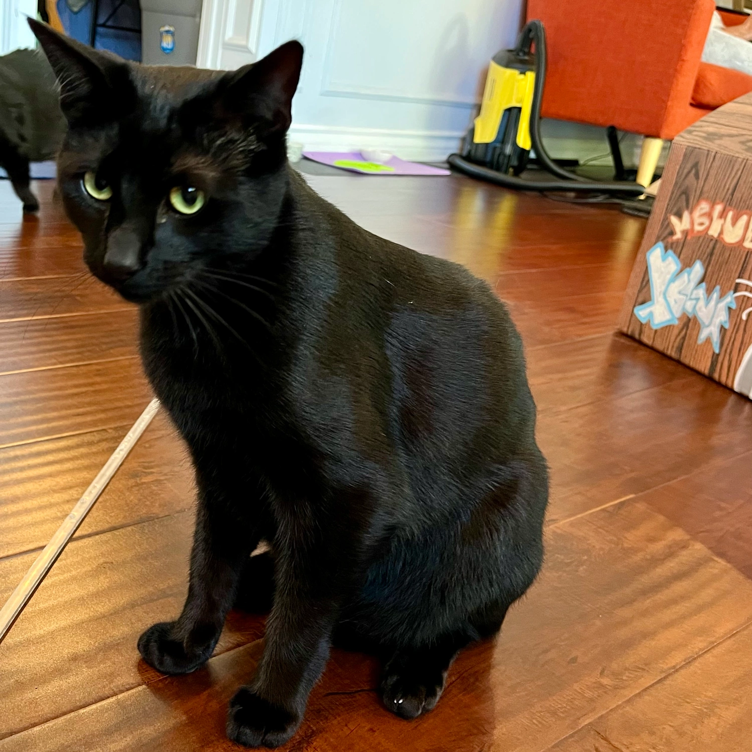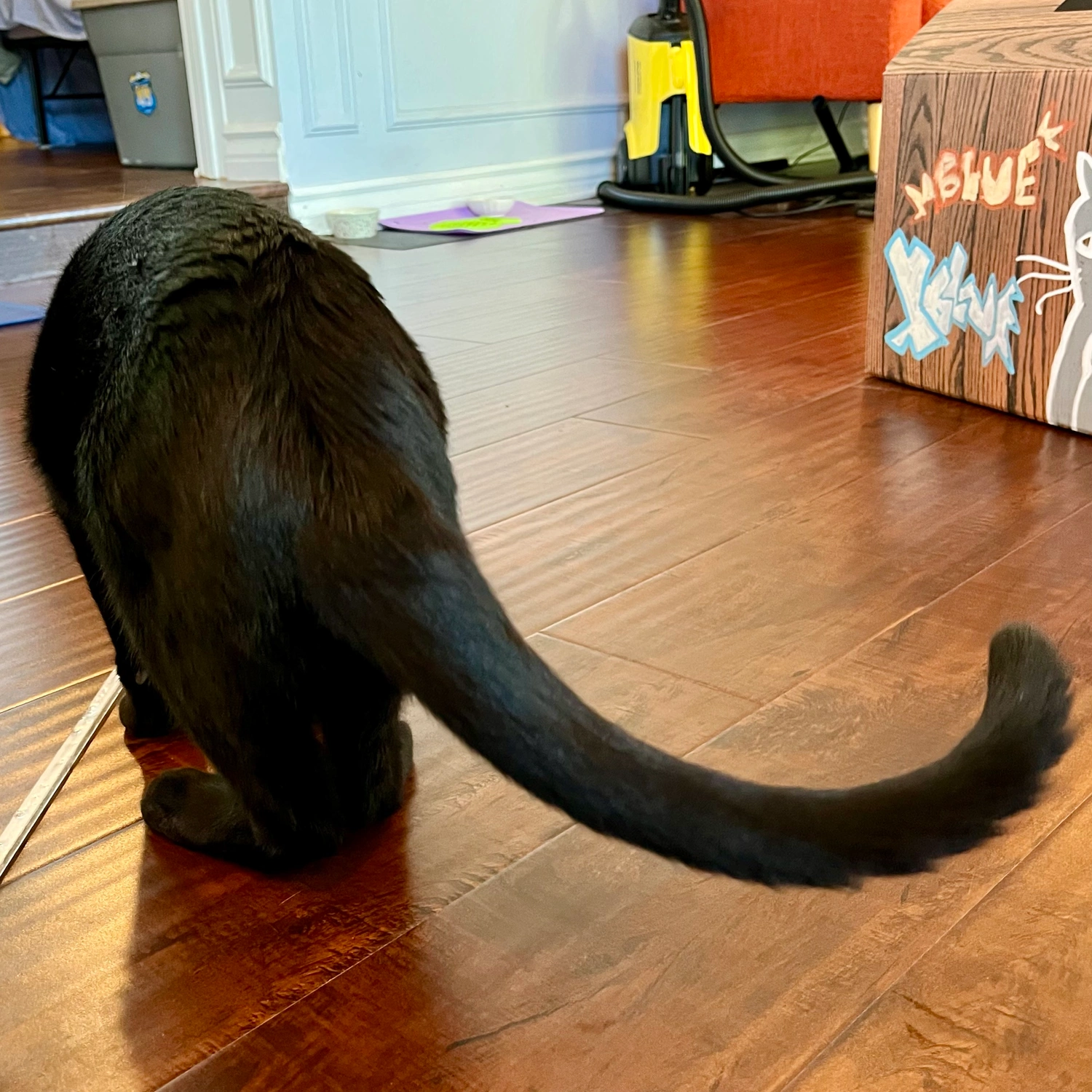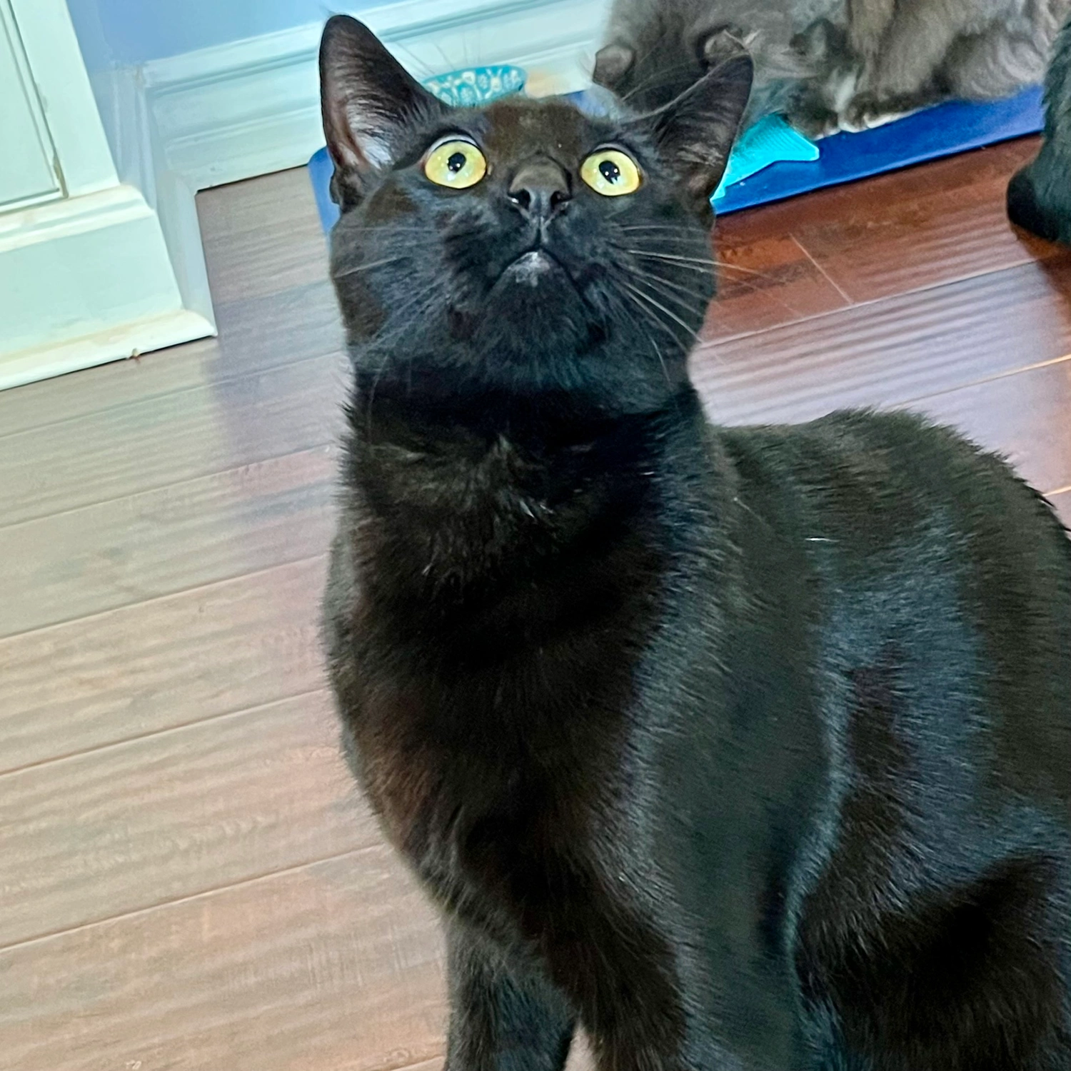Blu is fully black with a long tail, he's very shy but very affectionate and playful when he gets to know you.