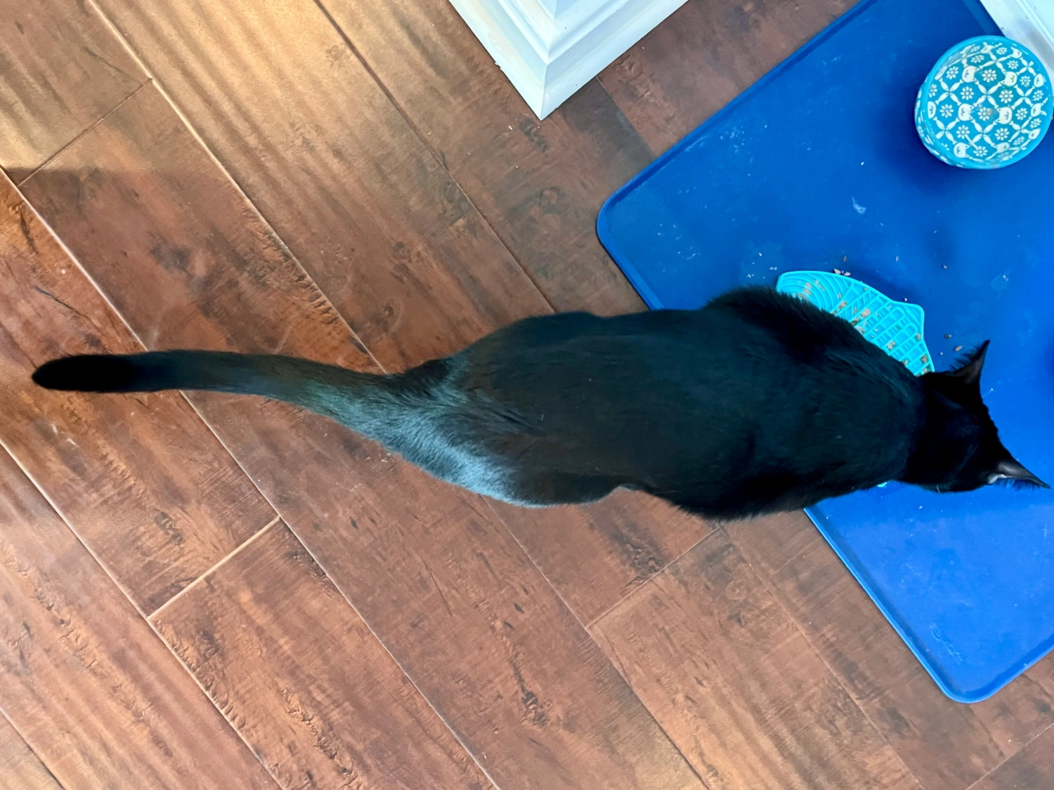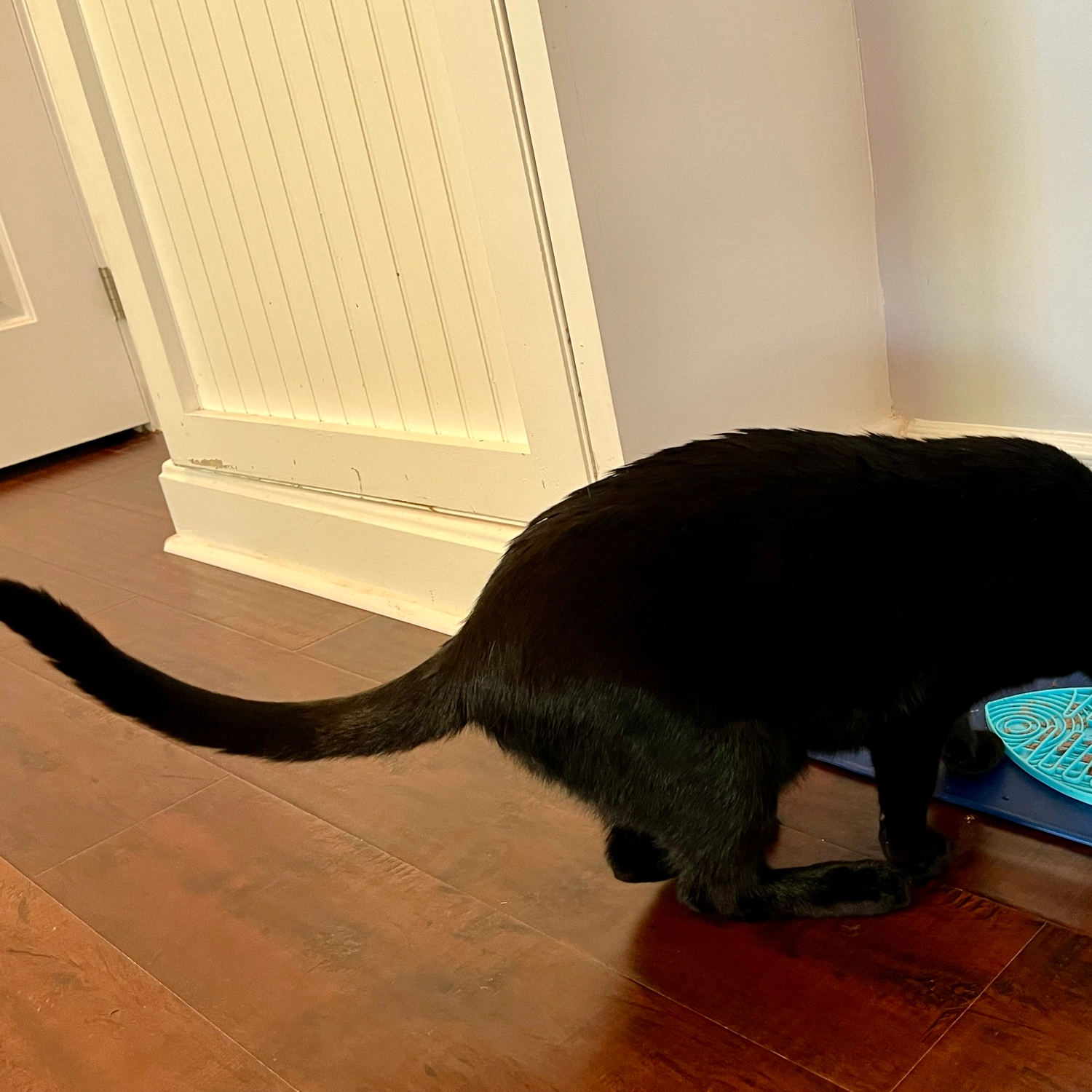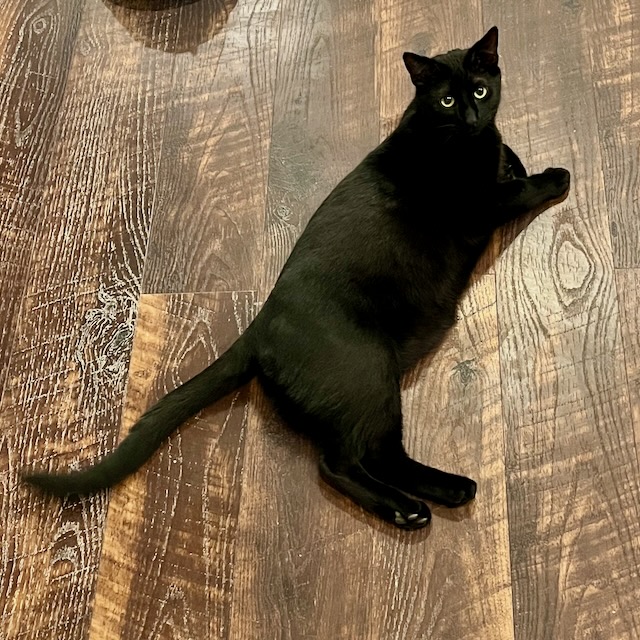 Blu is fully black with a long tail, he's very shy but very affectionate and playful when he gets to know you.