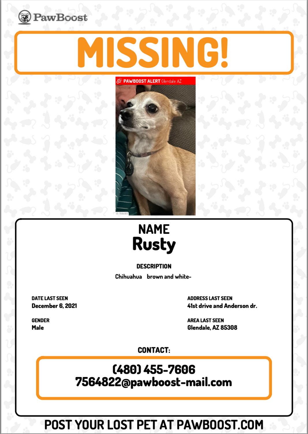 Rusty is a fun and happy doggie. always happy and wags tail when you are near. He is a treat lover. very affectionate. He may run if you get close, he is lost and probably confused. he is about 7 years old.