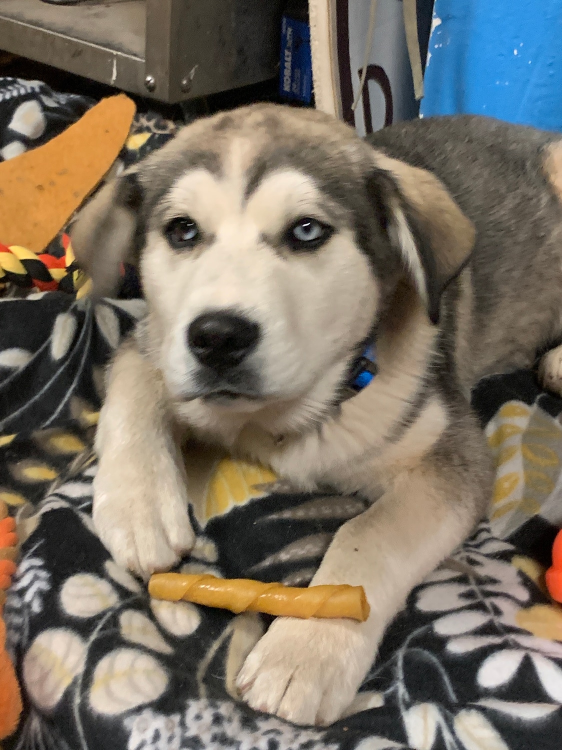 Blue is a husky with one full blue eye and the other eye is half blue half brown and he is still a puppy.