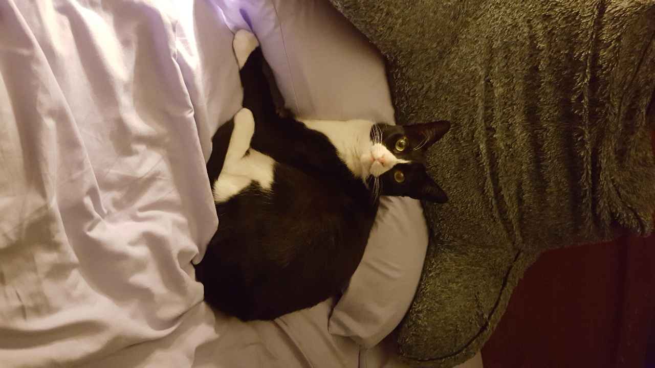 17 pound Tuxedo cat with pink nose and green eyes. 5 year-old female. Normally an indoor cat. Black back and white front.