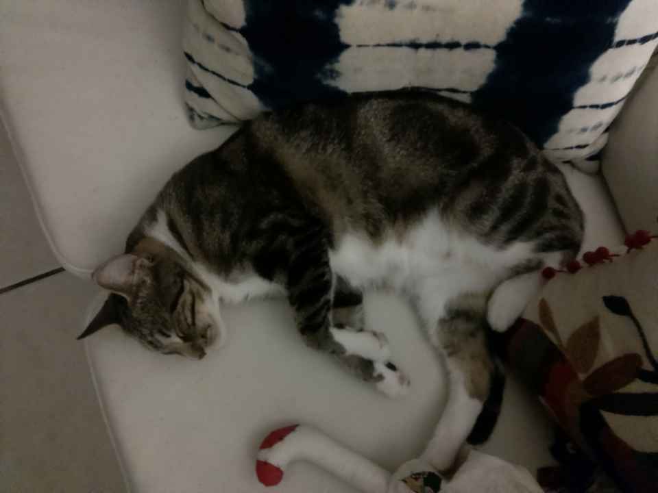 BLACK STRIPES GOING DOWN BACK 2 WHITE FRONT PAWS 2 WHITE KNEE-HIGH SOCKS BLACK BULLSEYE ON HER SIDE WHITE CHIN AND BELLY!