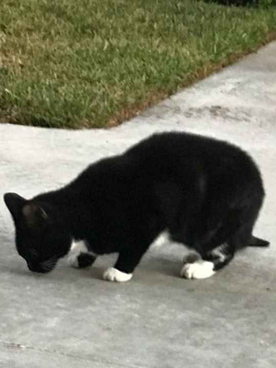 very sweet and friendly but was very hungry so has probably been outside for several days; definitely is someone's pet