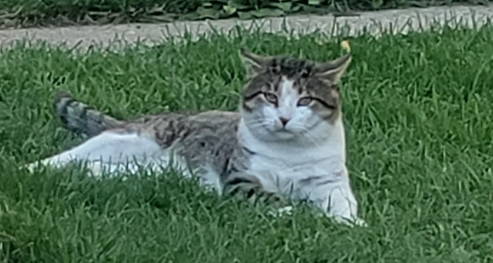 Not neutered. Scar around nose. Has some tiger stripes. Left front legs is solid white the right legs has tiger stripes.